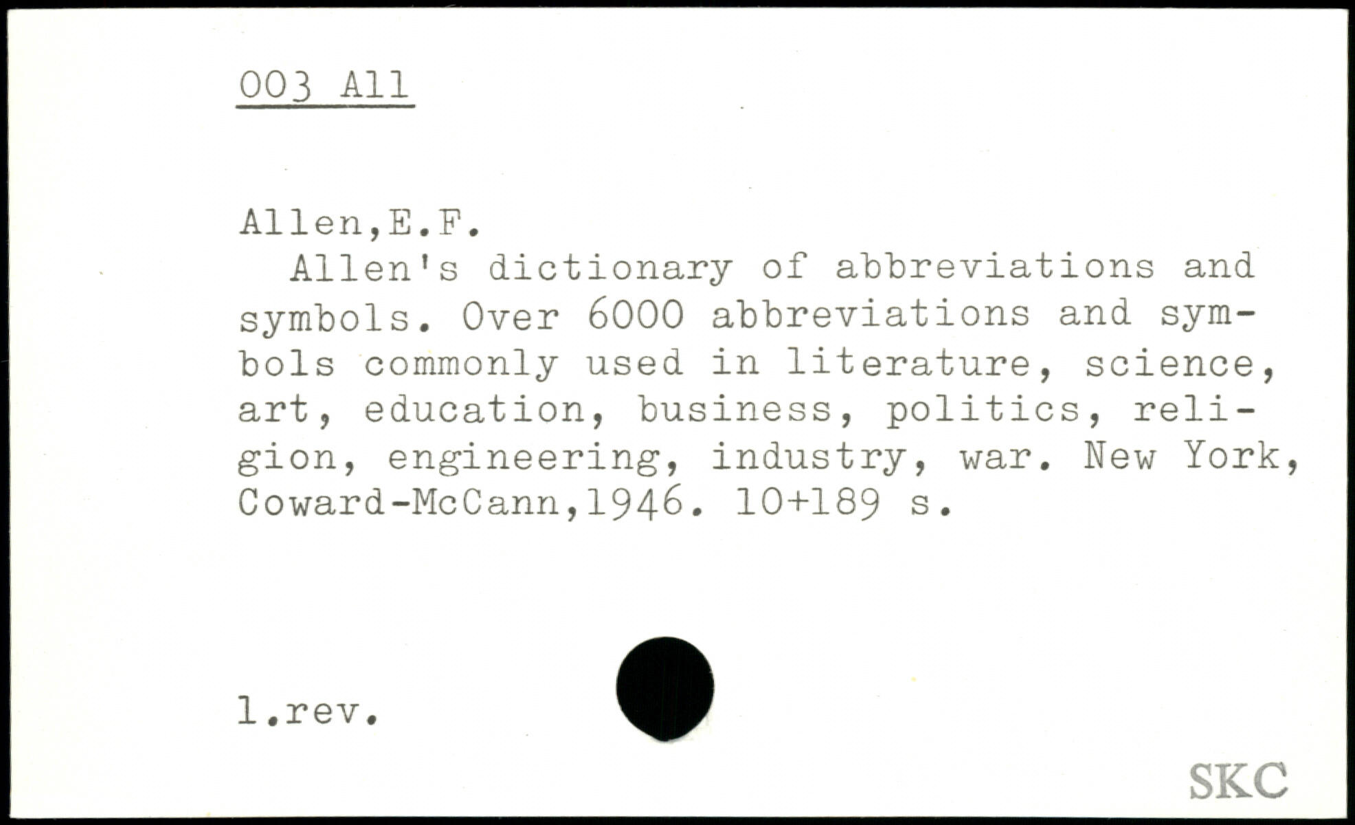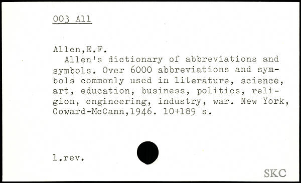 Allen's dictionary of abbreviations and symbols. Over 6000 abbreviations and symbols commonly used in literature, science, art, education, business, politics, religion, engineering, industry, war.