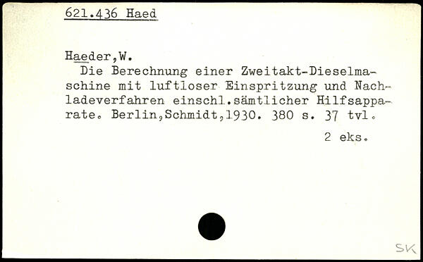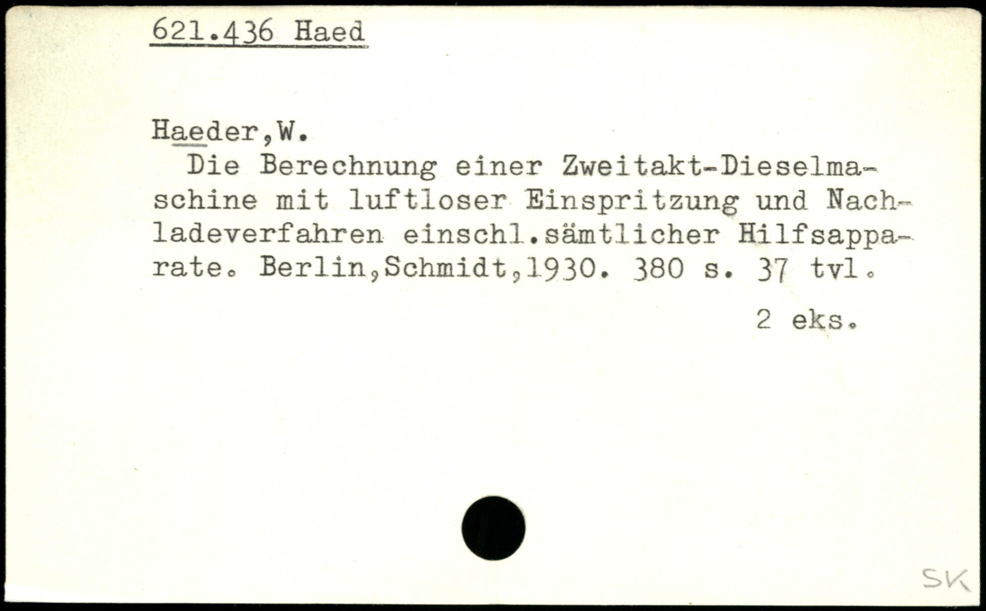 Die Berechnung einer Zweitakt-Dieselmaschine mit luft-loser Einspritzung und Nachladeverfahren einschl.sämtlicher Hilfsappa-rate, Berlin9Schmidt,1930.