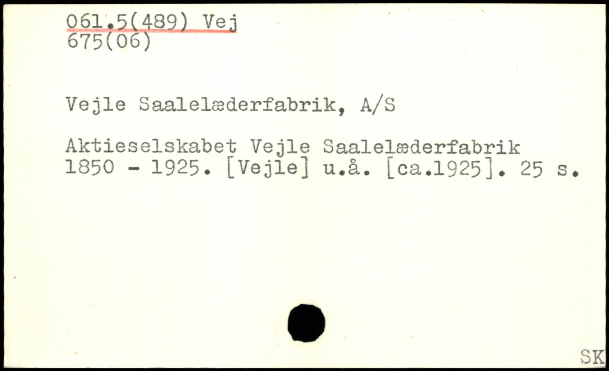 Vejle Saalelæderfabrik, A/S Aktieselskabet Vejle Saalelæderfabrik 1850 - 1925. [Vejle] u.å.