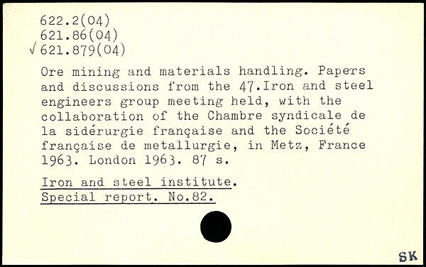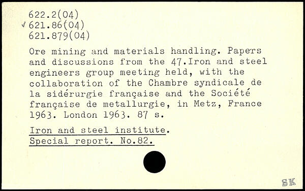 Ore mining and materials handling. Papers and discussions from the 47,Iron and steel engineers group meeting held, with the collaboration of the Chambre syndicale de la sidérurgie française and the Société française de métallurgie, in Metz, France 1963. London 19&3.