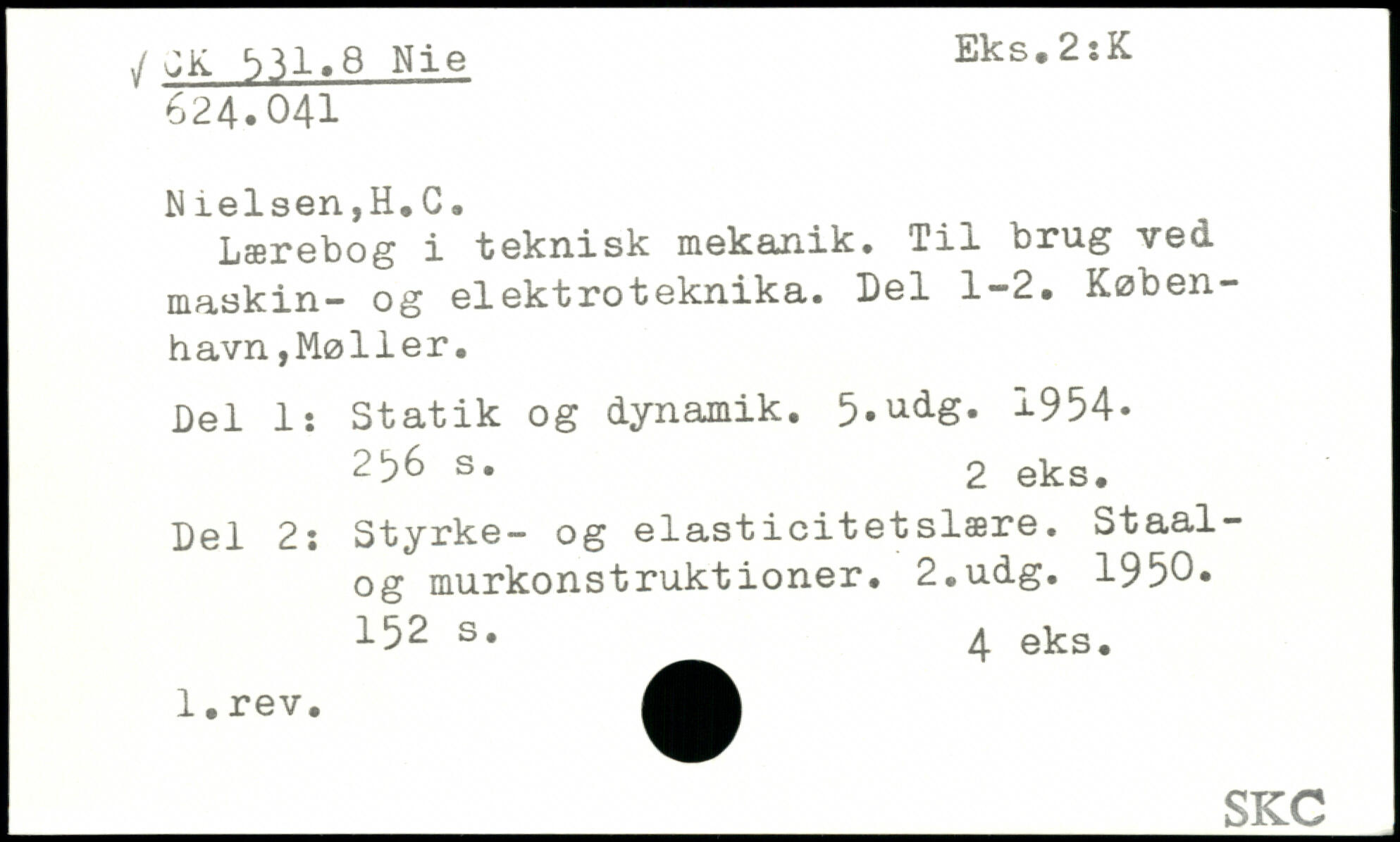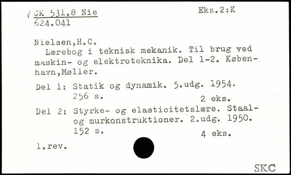 Lærebog i teknisk mekanik. Til brug ved maskin- og elektroteknika. Del 1-2. København ,Mølier. Del 1: Statik og dynamik. 5.udS- 1954.