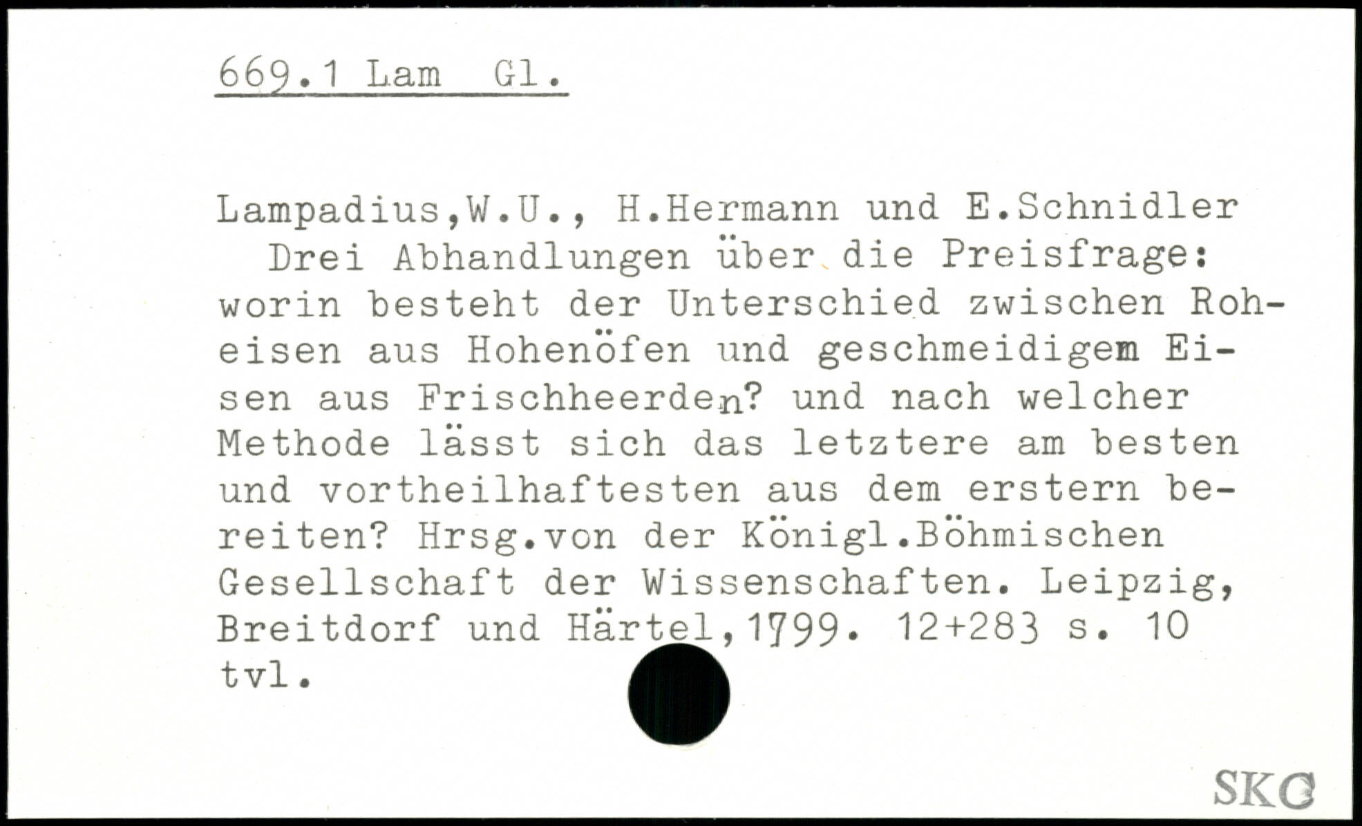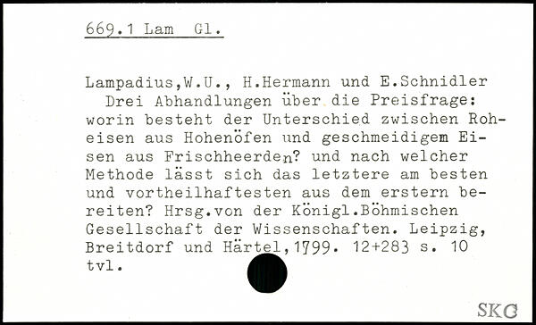 Lampadius,W.U., H.Hermann und E.Schnidler Drei Abhandlungen über die Preisfrage: worin besteht der Unterschied zwischen Roheisen aus Hohenofen und geschmeidigem Eisen aus Frischheerden? und nach welcher Methode lässt sich das letztere am besten und vortheilhaftesten aus dem erstem bereiten? Hrsg.von der Königl.Böhmischen Gesellschaft der Wissenschaften. Leipzig, Breitdorf und Härt^, 1799.