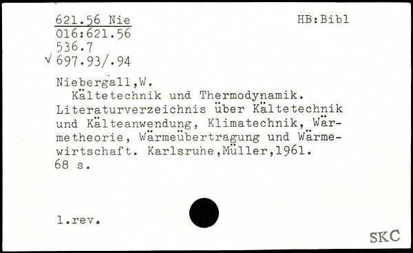 Kältetechnik und Thermodynamik. Literaturverzeichnis über Kältetechnik und Kälteanwendung, Klimatechnik,^Wärme theorie, Wärmeübertragung und Wärme-wirtschaft.