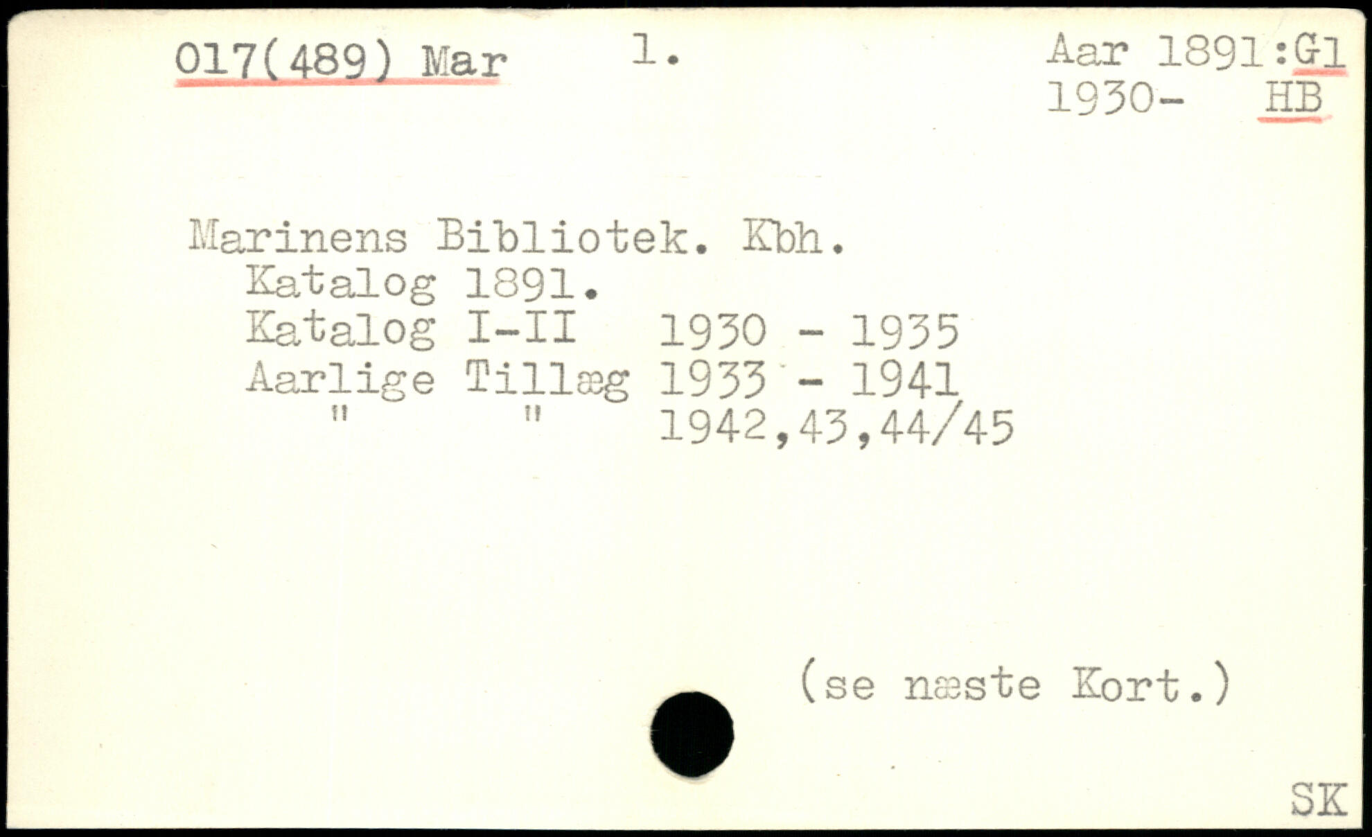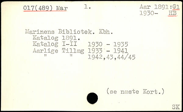 Marinens Bibliotek. Kbh. Katalog 1891. Katalog I-II 1930 - 1935 Aarlige Tillæg 1933 - 1941 " " 1942,43,44/45
