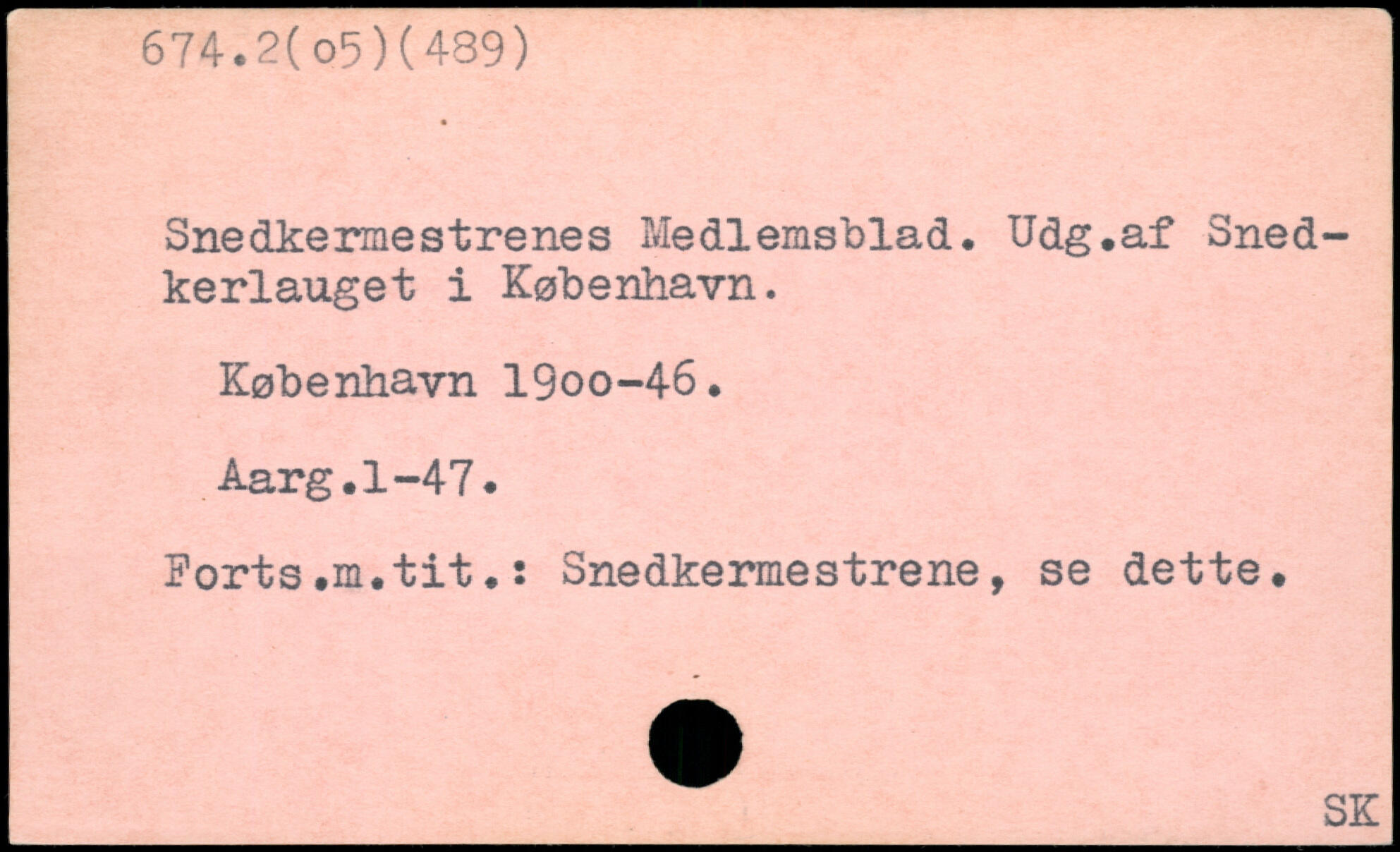 Snedkermestrenes Medlemsblad, Udg.af Sned-kerlauget i København. København 19oo-46. Aarg.1-47. Forts.m.tit.: Snedkermestrene, se dette. _SK
