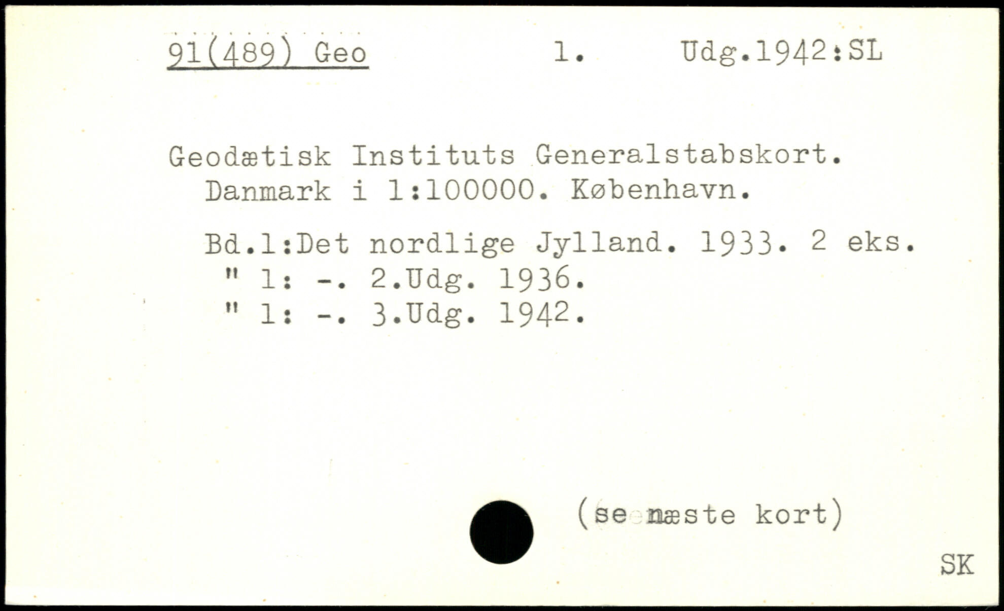 Geodætisk Instituts Generalstabskort. Danmark i 1:100000. København. Bd.liDet nordlige Jylland. 1933, 2 eks. " 1: -. 2.Udg. 1936. M 1: -. 3.Udg. 1942.