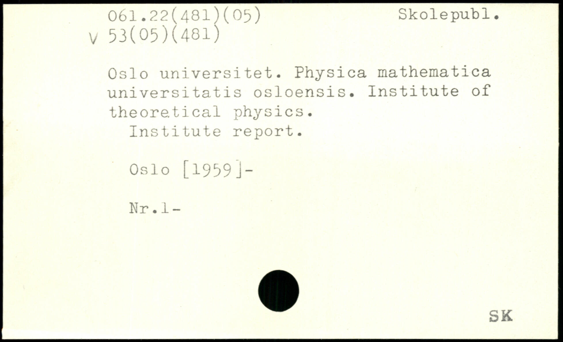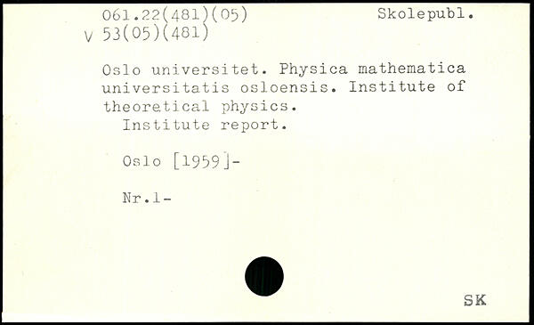 Oslo universitet. Physica mathematica universitatis osloensis. Institute of theoretical physics. Institute report. Oslo [1959]- Nr. 1 -