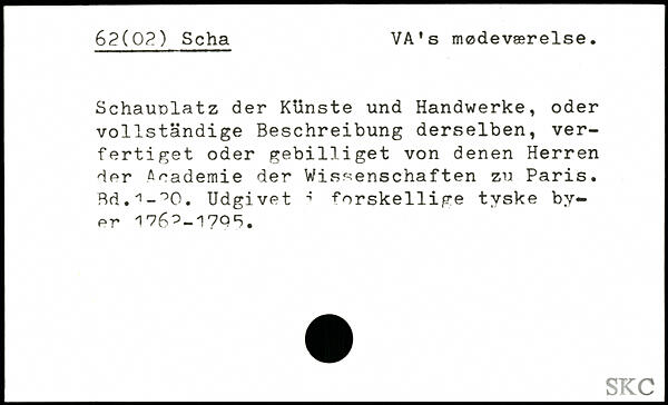 62(0?) Scha VA’s mødeværelse. Schauplatz der Künste und Handwerke, oder vollständige Beschreibung derselben, verfertiget oder geb1111get von denen Herren der Aoademie der Wissenschaften zu Paris. Bd.^-^O. Udgivet ■’ forskellige tyske byer 176^-17QB.