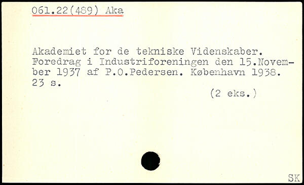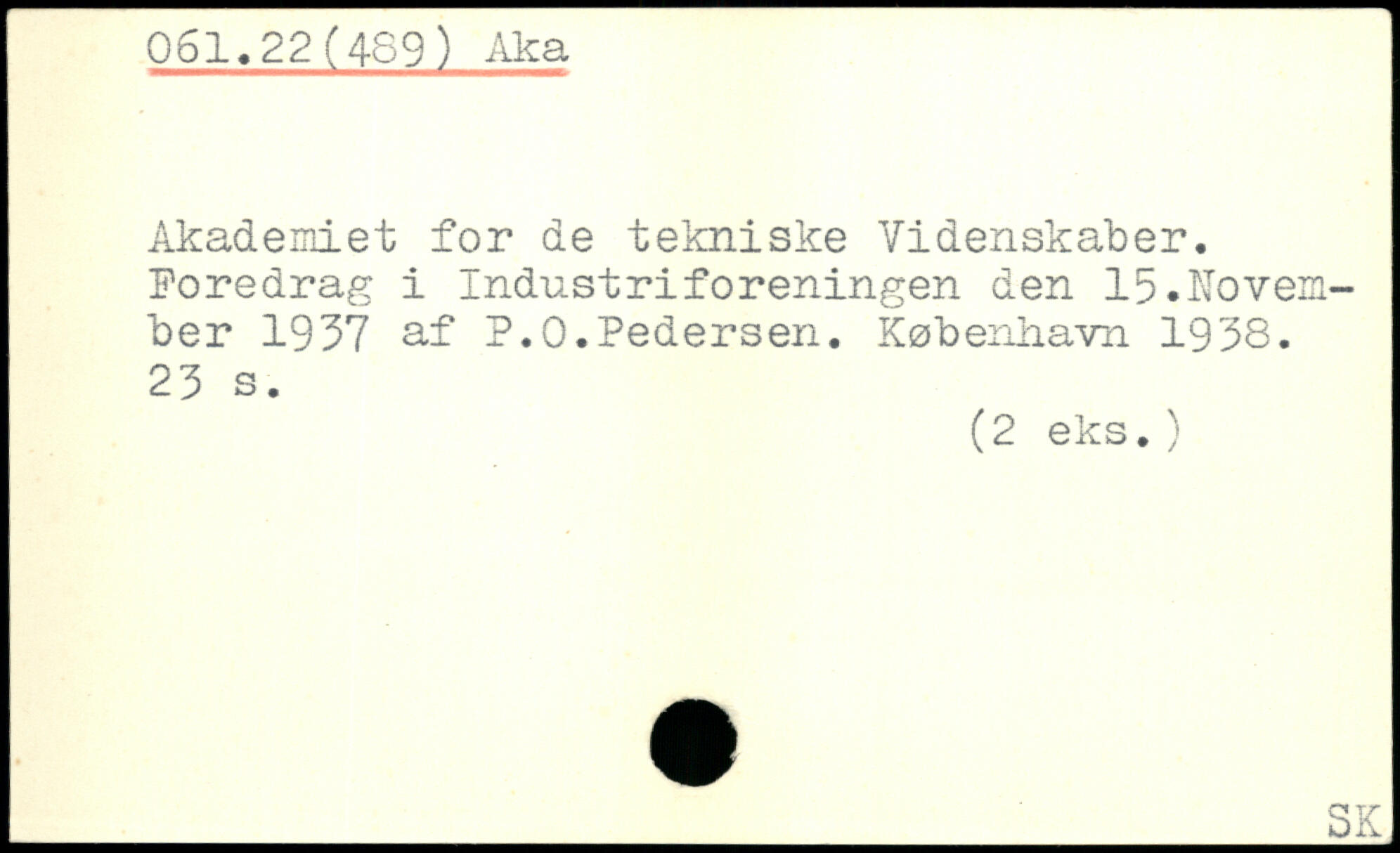 Akademiet for de tekniske Videnskaber. Foredrag i Industriforeningen den 15.November 1937 af P.0.Pedersen.