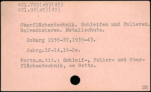 Oberflächentechnik. Schleifen und Polieren. G-alvanisieren. Metallschutz. Coburg 1935-37>1939-43. Jahrg.12-14,l6-2o. Forts.m.tit.: Schleif-, Polier- und Oberflächentechnik, se dette.