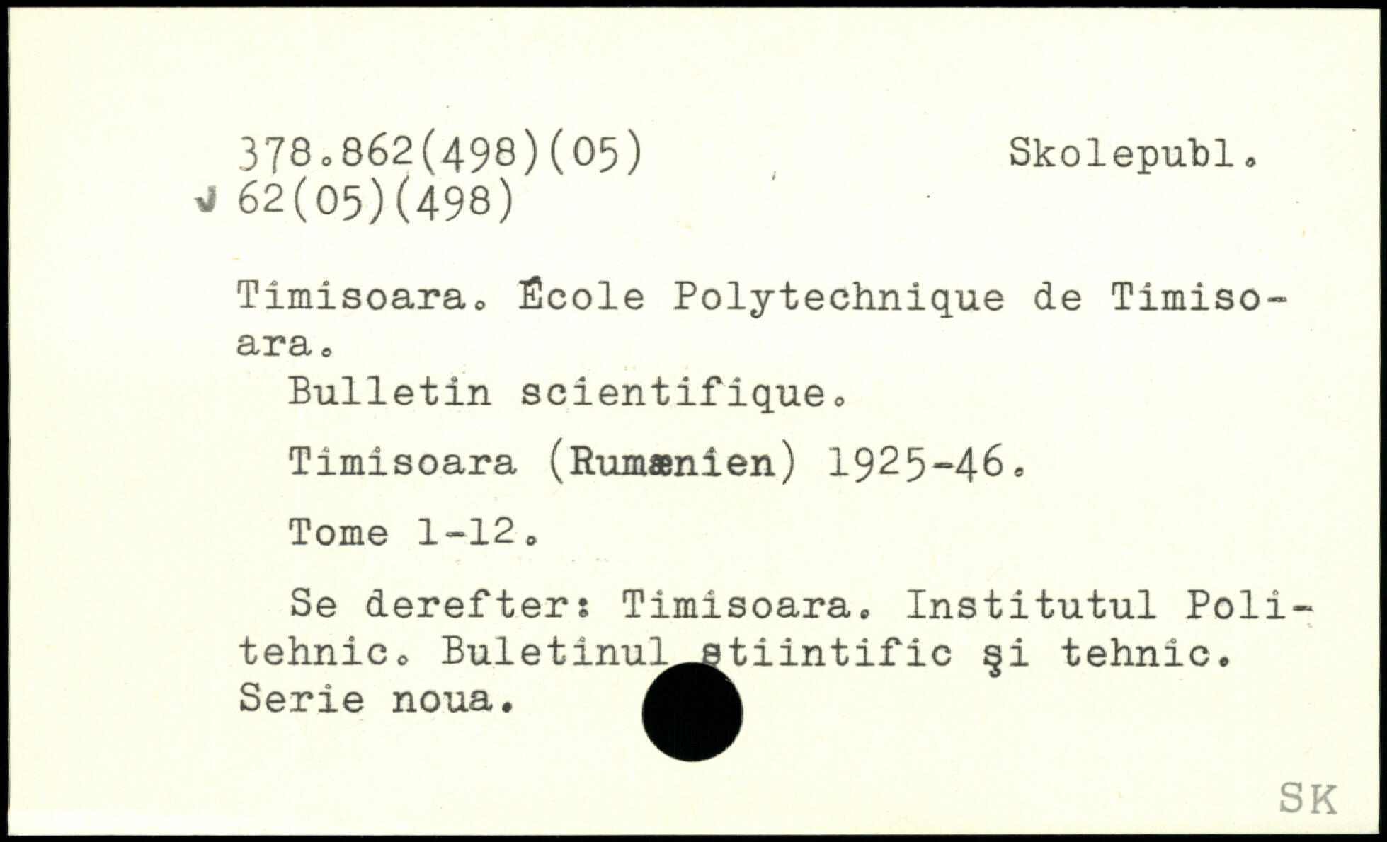 Timisoara. École Polytechnique de Timisoara. Bulletin scientifique, Timisoara (Rumænien) 1925-46, Tome 1-12, Se derefters Timisoara, Institutul Poli-tehnic, Buletinu^^tiintific §i tehnic. Serie noua.