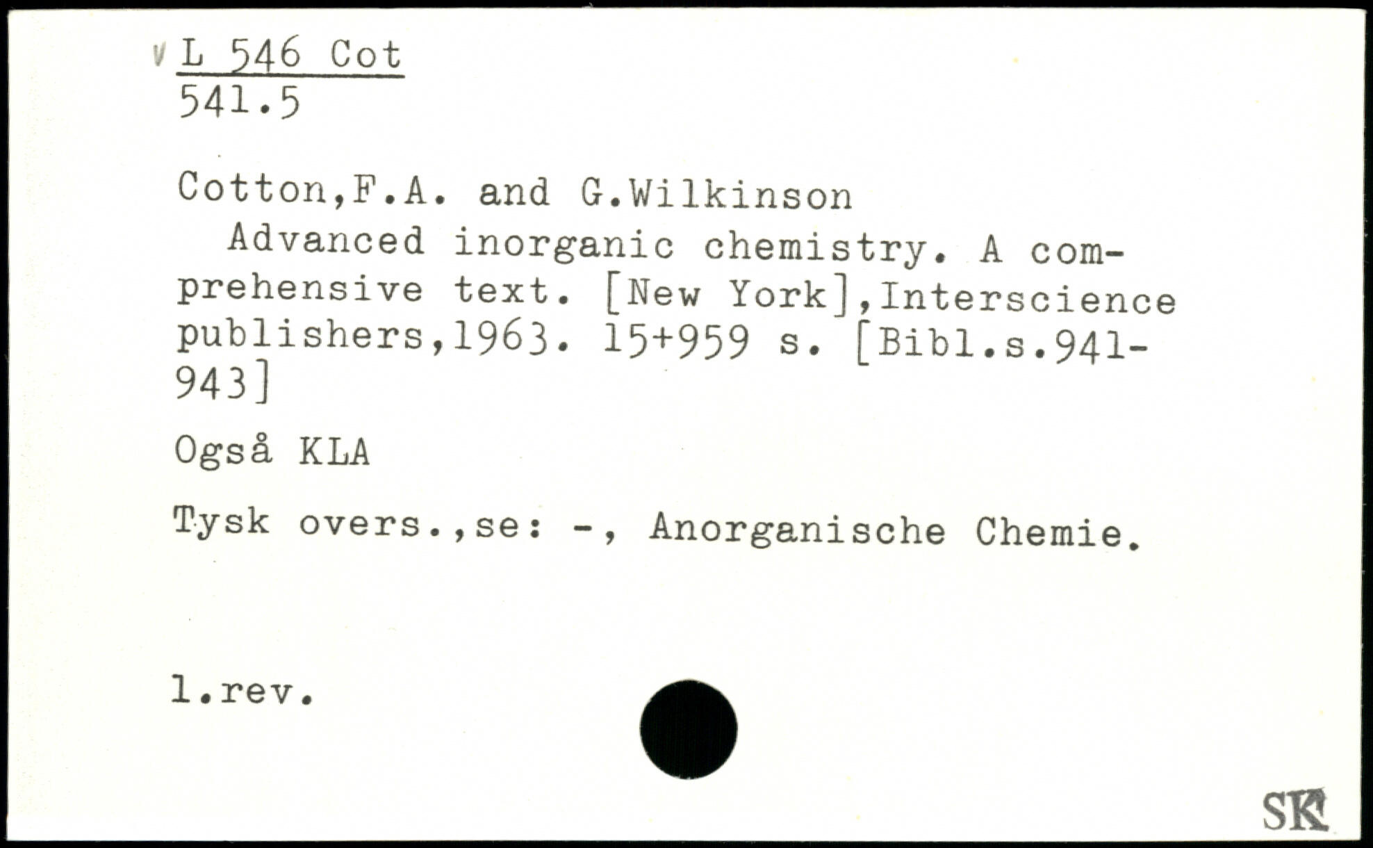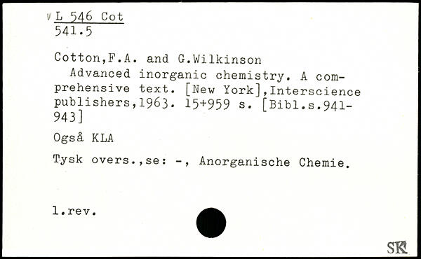 Advanced inorganic chemistry. A comprehensive text. [New York],Interscience publishers,1963.
