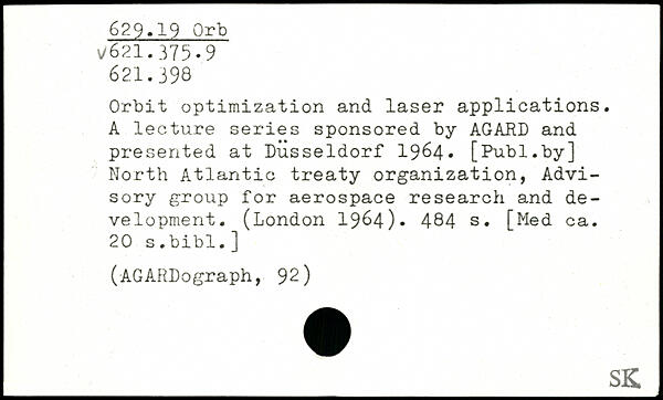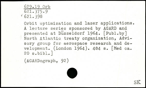 Orbit optimization and laser applications. A lecture series sponsored by AGARD and presented at Düsseldorf 1964.
