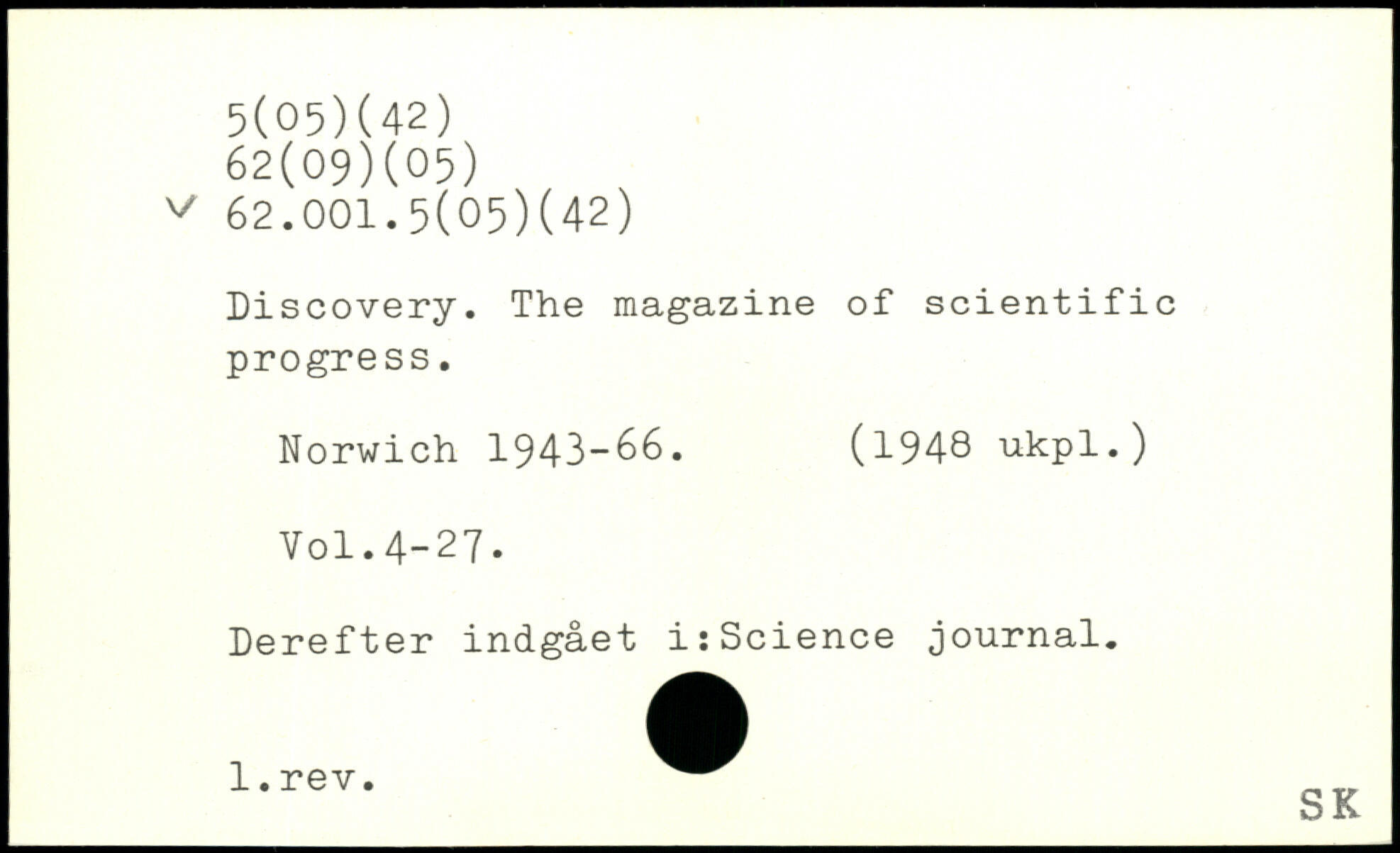 Discovery. The magazine of scientific progress. Norwich 1943-66. (1948 ukpl.) Vo1.4-27. Derefter indgået i:Science journal. 1-rev-___SK_