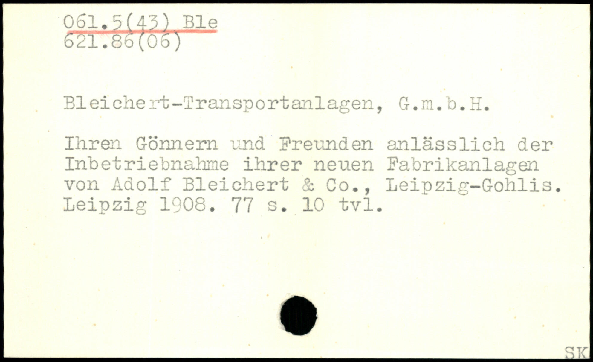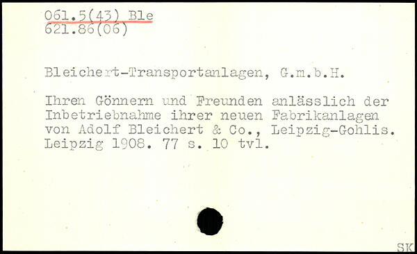 Bl ei ehe rt -T r ansp o r t anl agen, G. m. b. H. Ihren Gönnern und Freunden anlässlich der Inbetriebnahme ihrer neuen Fabrikanlagen von Adolf Bleichert & Co., Leipzig-Gohlis.