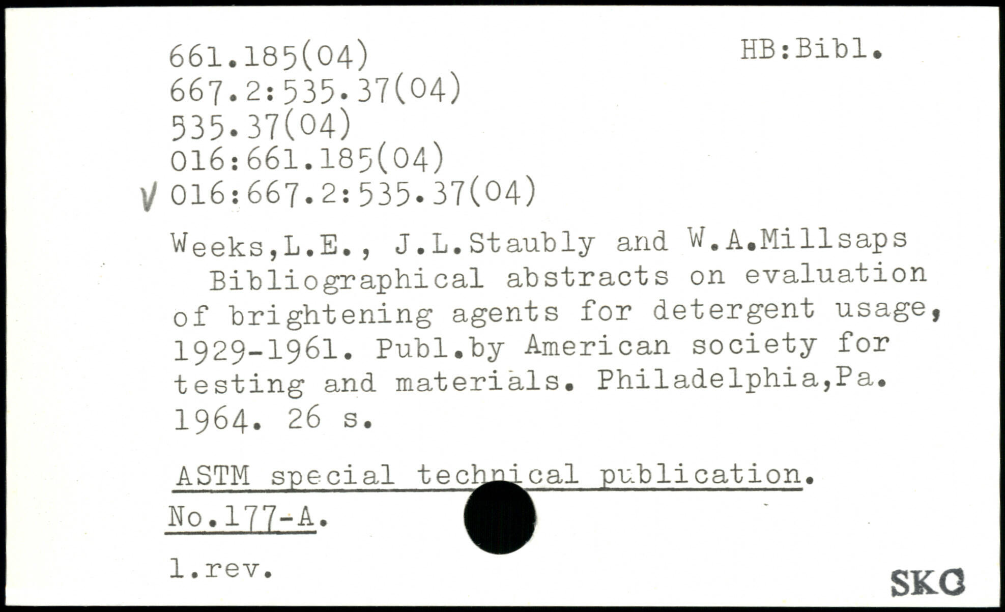 Weeks,L.E., J.L.Staubly and W.A.Millsaps Bibliographical abstracts on evaluation of brightening agents for detergent usage, 1929-1961.