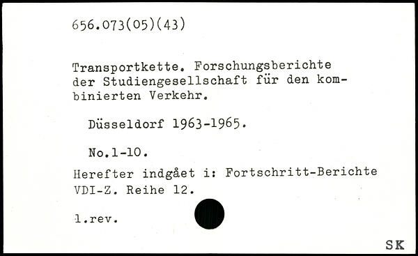 Transportkette. Forschungsberichte der Studiengesellschaft für den kombinierten Verkehr. Düsseldorf 1963-1965, No.1-10. Herefter indgået i; Fortschritt-Berichte VDI-Z. Reihe 12.