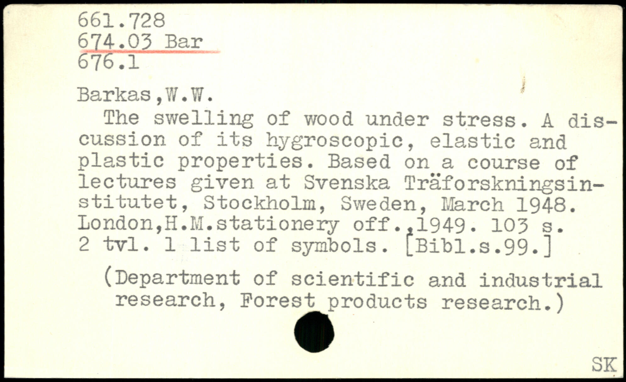 The swelling of wood under stress. A discussion of its hygroscopic, elastic and plastic properties. Based on a course of lectures given at Svenska Träforskningsinstitutet, Stockholm, Sweden, March 1948. London,H.M.stationery off.,1949.