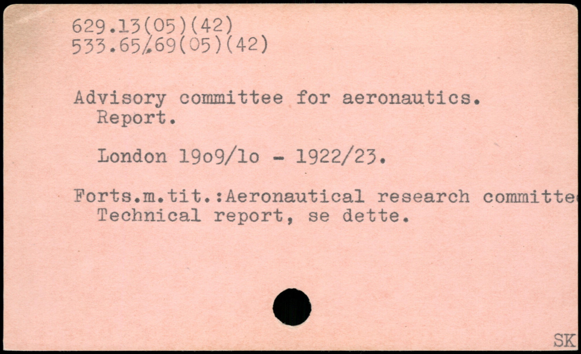Advisory committee for aeronautics. Report. London 19o9/lo - 1922/23. Forts.m.titAeronautical research committe Technical report, se dette.