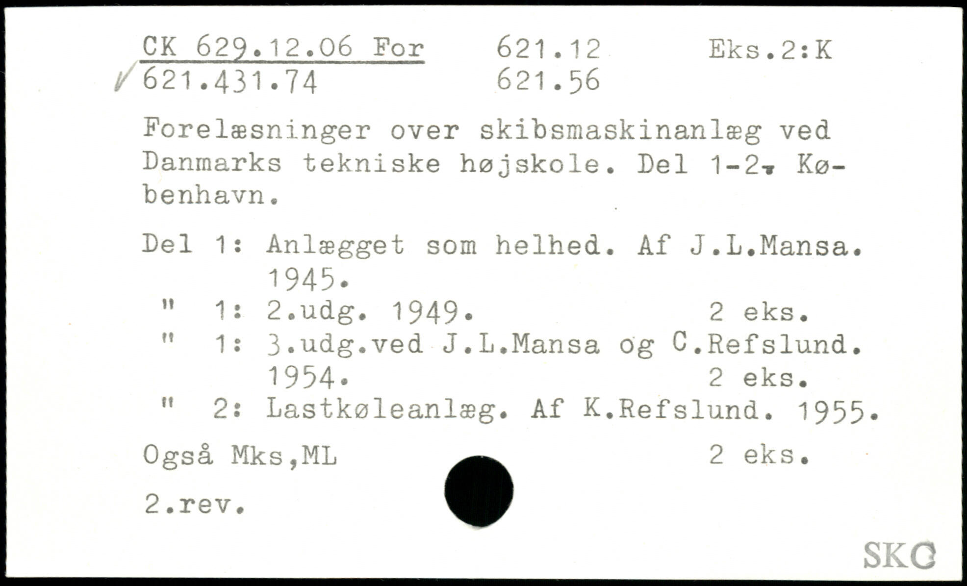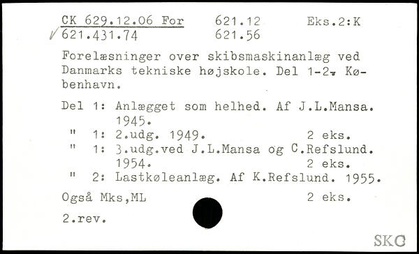 Forelæsninger over skibsmaskinanlæg ved Danmarks tekniske højskole. Del 1-2-, København. Del 1: Anlægget som helhed. Af J.L.Mansa. 1945. " 1: