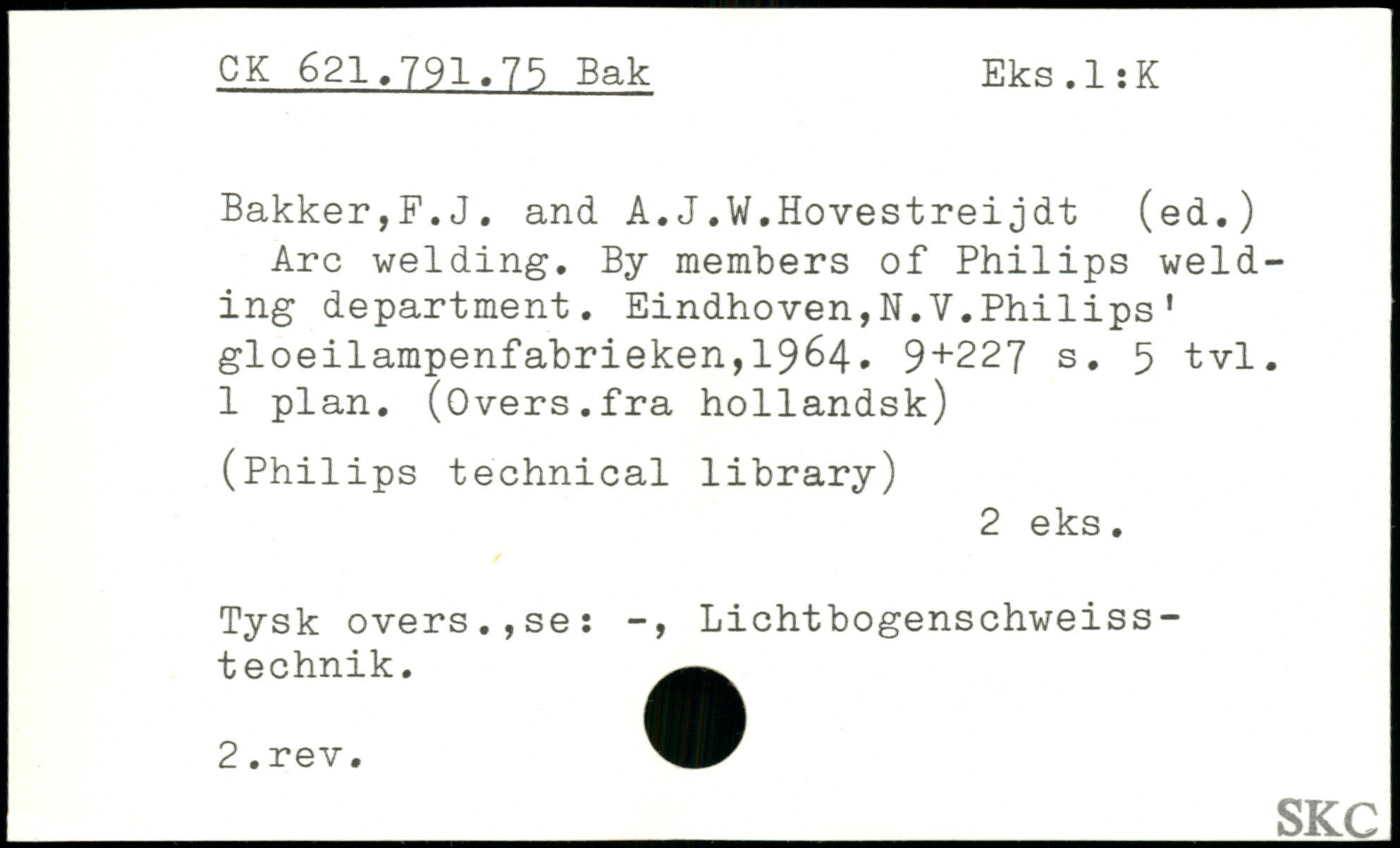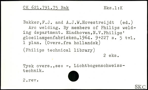Arc welding. By members of Philips welding department. Eindhoven,N.V.Philips' gloeilampenfabrieken,1964-.