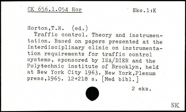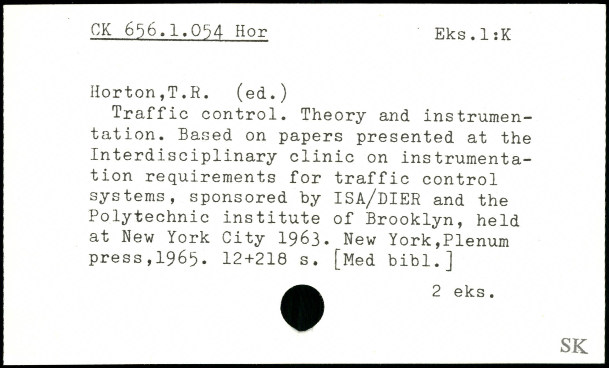 Traffic control. Theory and instrumentation. Based on papers presented at the Interdisciplinary clinic on instrumentation requirements for traffic control systems, sponsored by ISA/DIER and the Polytechnic institute of Brooklyn, held at New York City 1963.