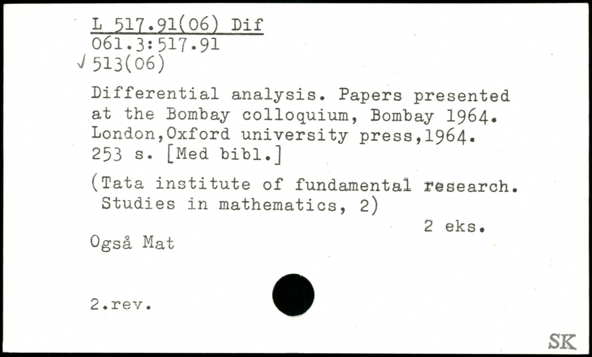 Differential analysis. Papers presented at the Bombay colloquium, Bombay 1964.