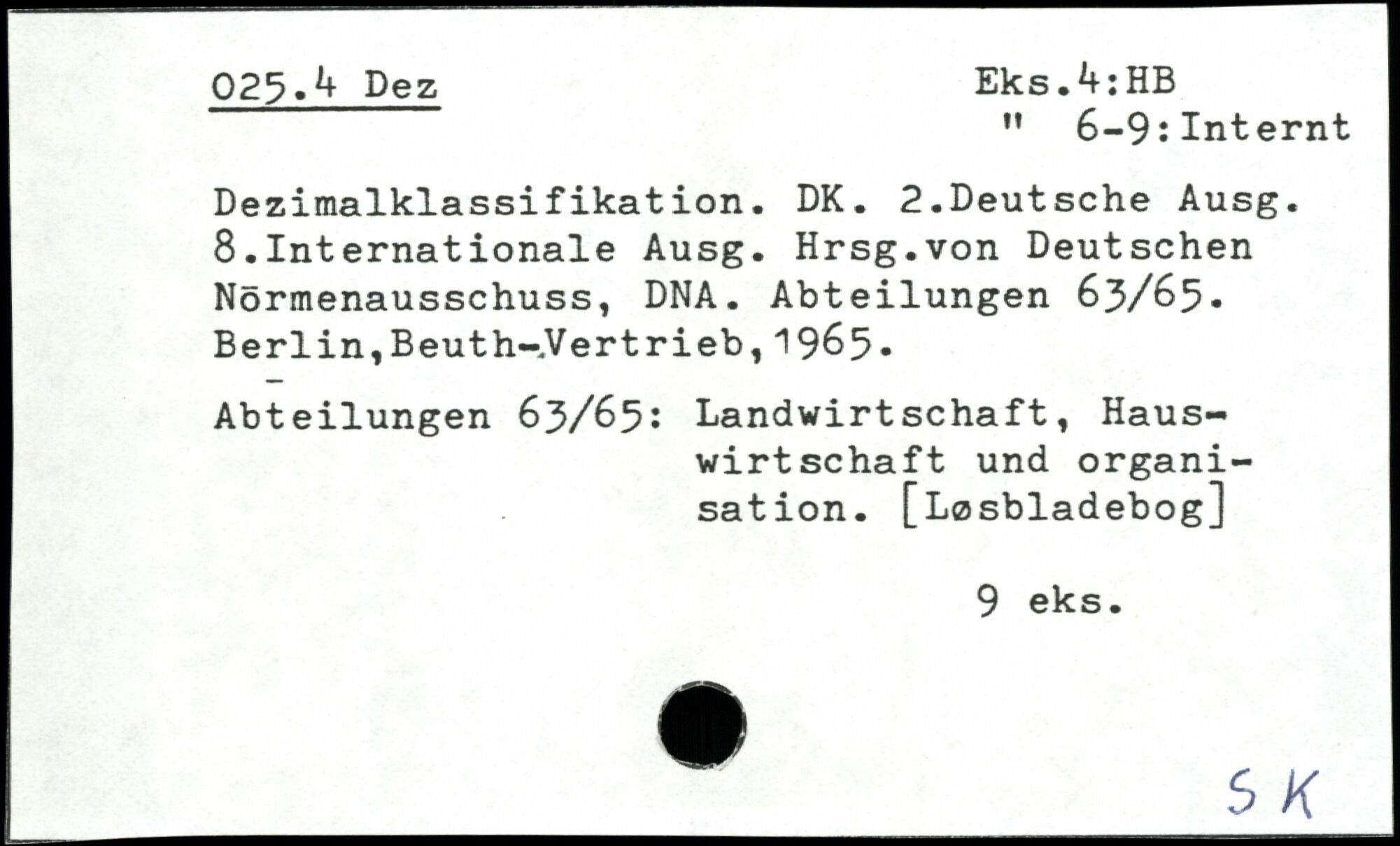 " 6-9:Internt Dezimalklassifikation. DK. 2.Deutsche Ausg. 8.Internationale Ausg. Hrsg.von Deutschen i Normenausschuss, DNA. Abteilungen 63/65. Berlin,Beuth-.Vertrieb, 1965. Abteilungen 63/65: Landwirtschaft, Haus- : Wirtschaft und organisation. [Løsbladebog]