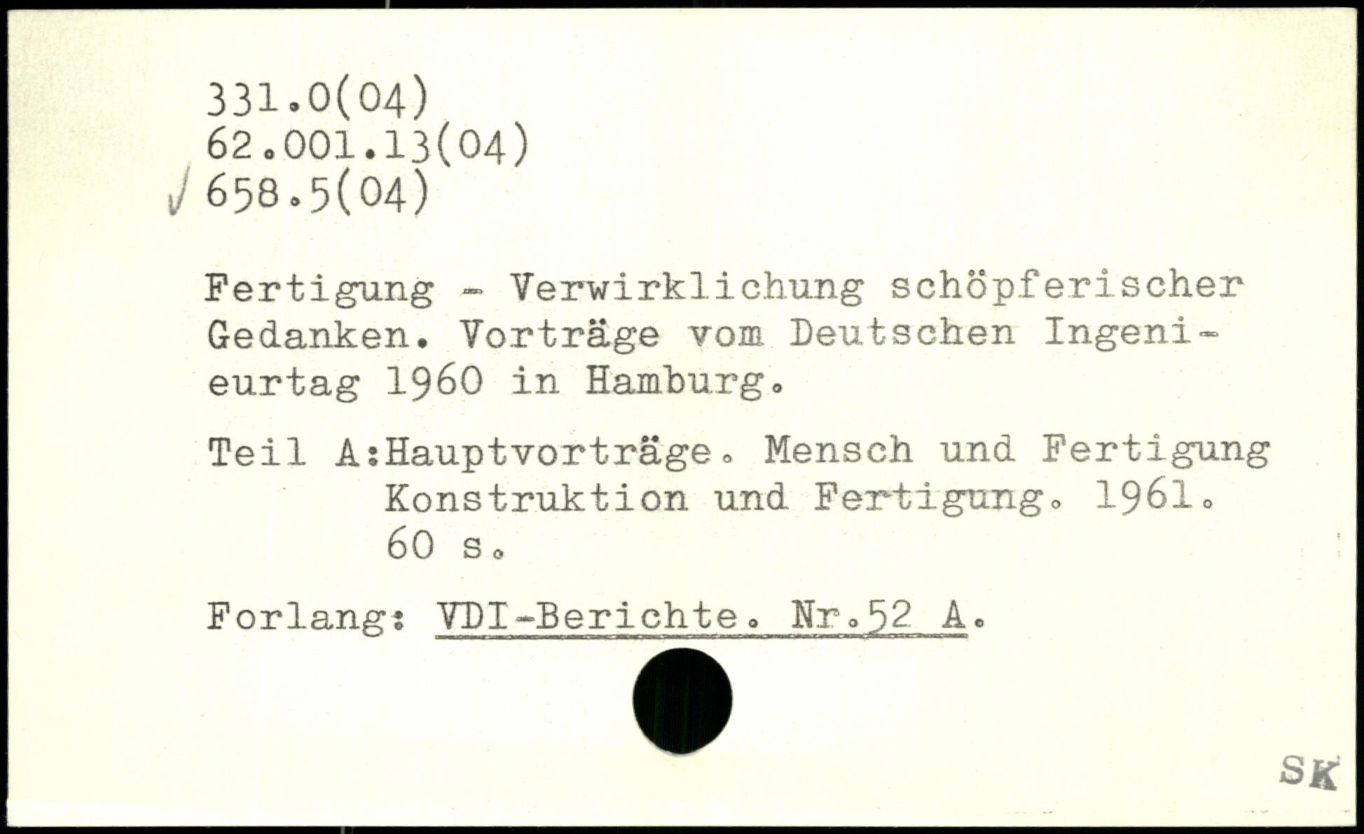 Fertigung - Verwirklichung schöpferischer Gedanken. Vorträge vom Deutschen Ingenieurtag 1960 in Hamburg. Teil AiHauptvorträge. Mensch und Fertigung Konstruktion und Fertigung. Forlang: VDI-Berichte. Nr.52 A.