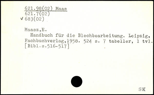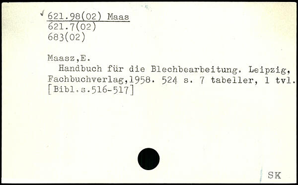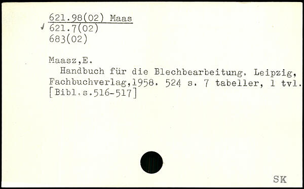 Handbuch für die Blechbearbeitung, Leipzig, Fachbuchverlag,1958. 524 s. 7 tabeller, 1 tvl. [Bibi.s.516-517]