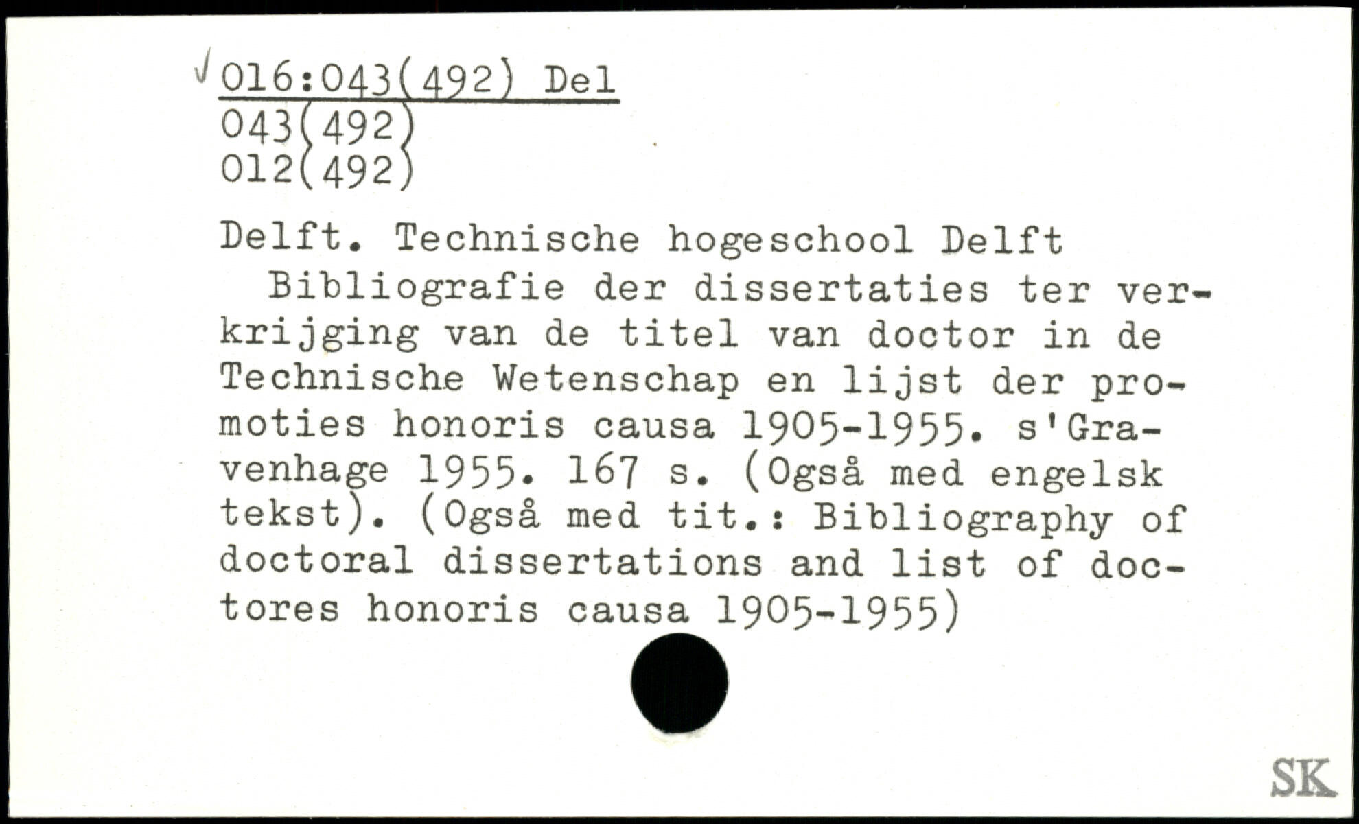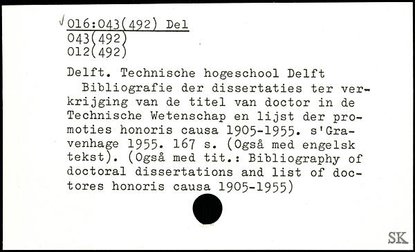 Delft. Technische hogeschool Delft Bibliografie der dissertaties ter ver-krijging van de titel van doctor in de Technische Wetenschap en lijst der pro-moties honoris causa 1905-1955. s’Gra-venhage 1955.
