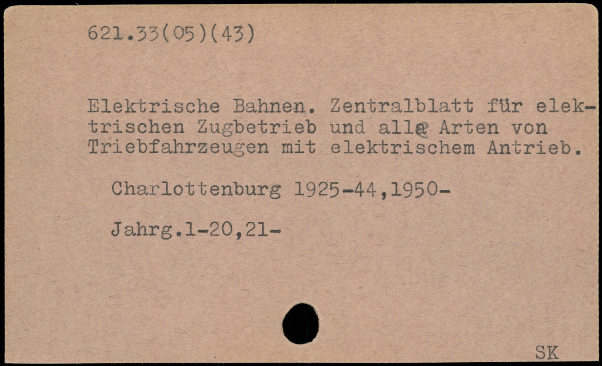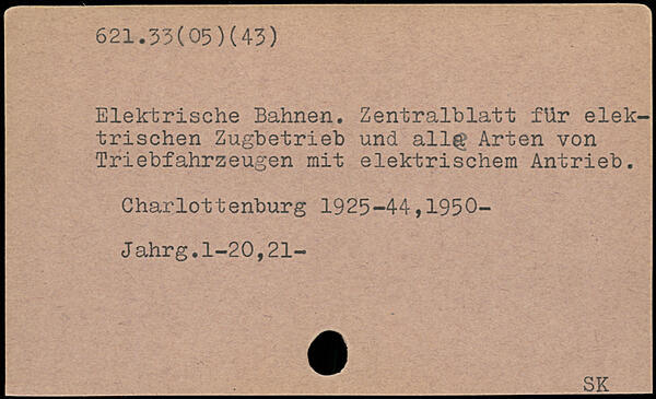 Elektrische Bahnen. Zentralblatt für elektrischen Zugbetrieb und all.? Arten von Triebfahrzeugen mit elektrischem Antrieb. Charlottenburg 1925-44,1950- Jahrg.1-20,21- ob"..