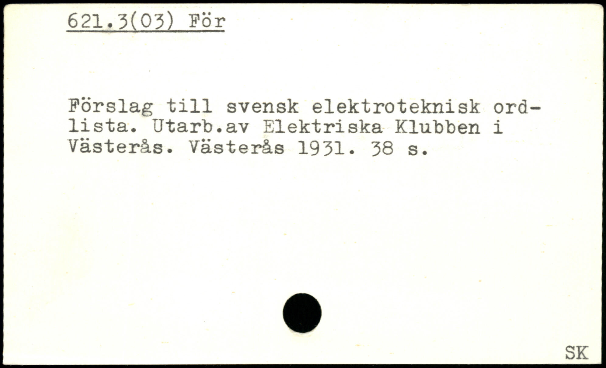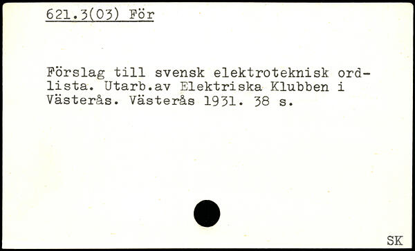 Förslag till svensk elektroteknisk ordlista. Utarb.av Elektriska Klubben i Västerås. Västerås 1931.