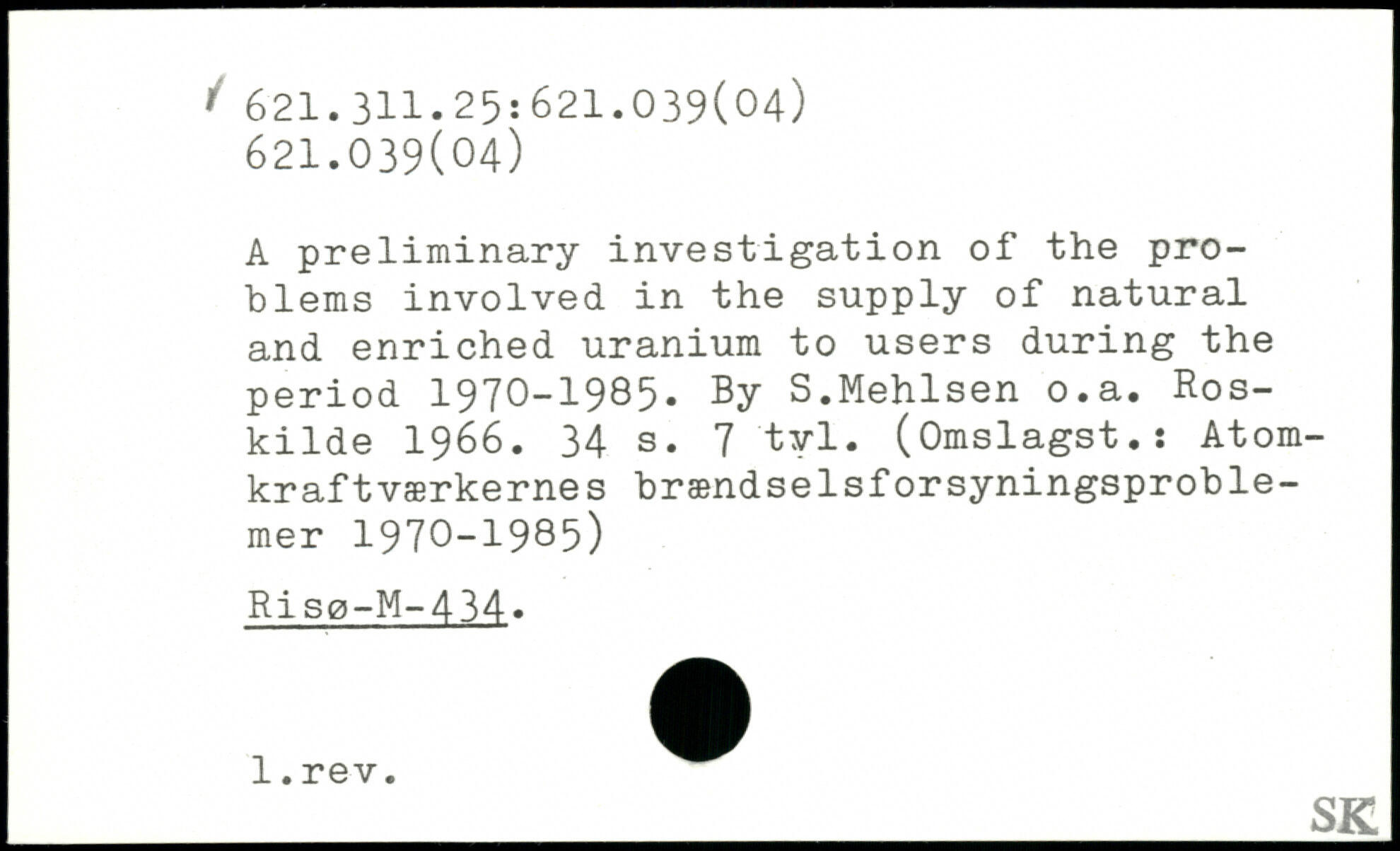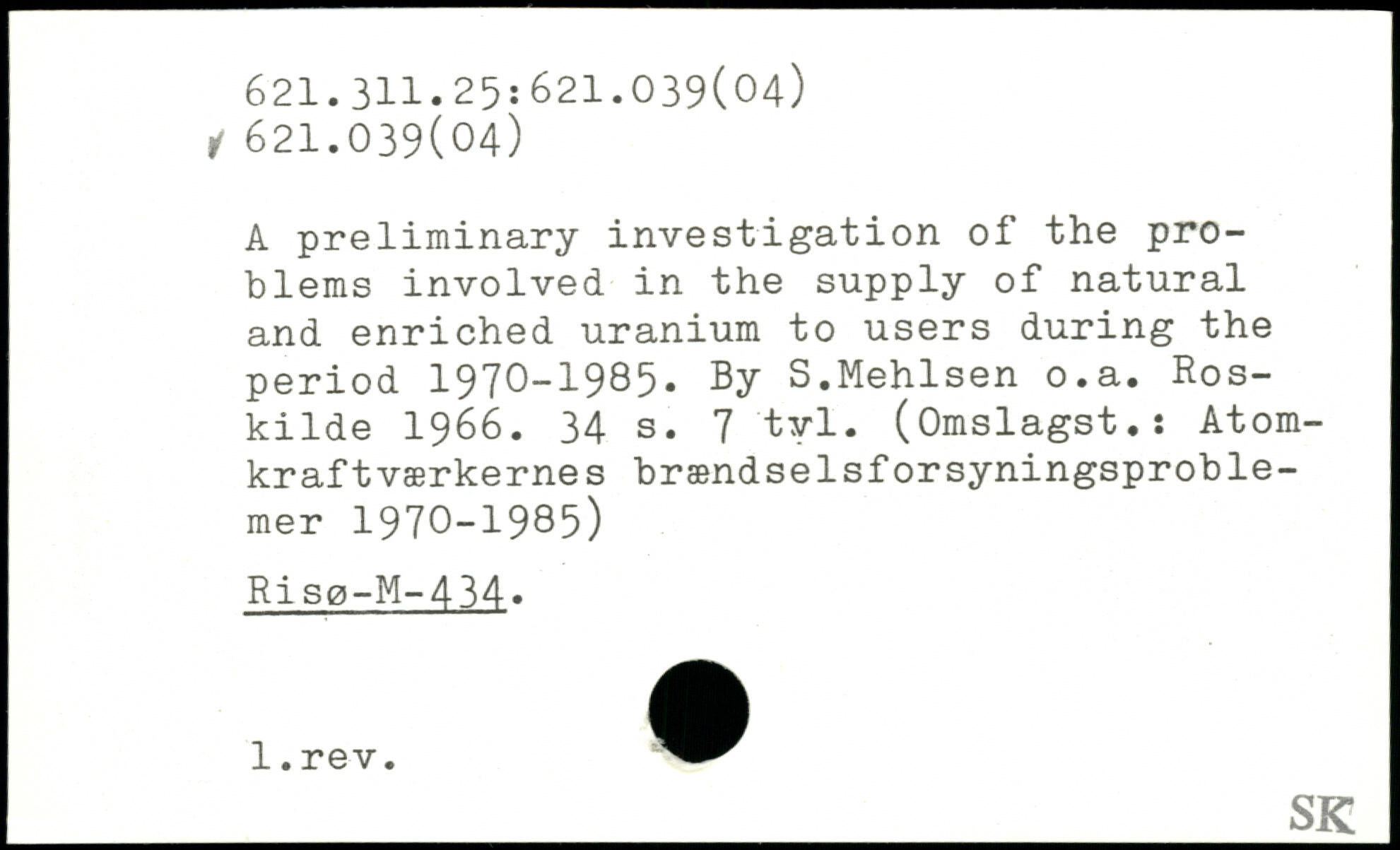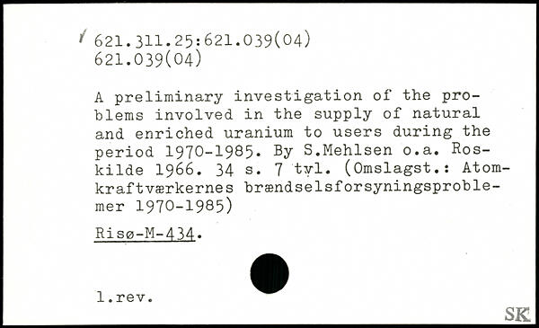 A preliminary investigation of the problems involved in the supply of natural and enriched uranium to users during the period 1970-1985. By S.Mehlsen o.a. Roskilde 1966.