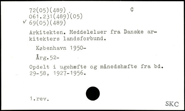 Arkitekten, Meddelelser fra Danske arkitekters landsforbund, København 19 50— Årg.52- Opdelt i ugehæfte og månedshæfte fra bd, 29-58, 1927-1956.