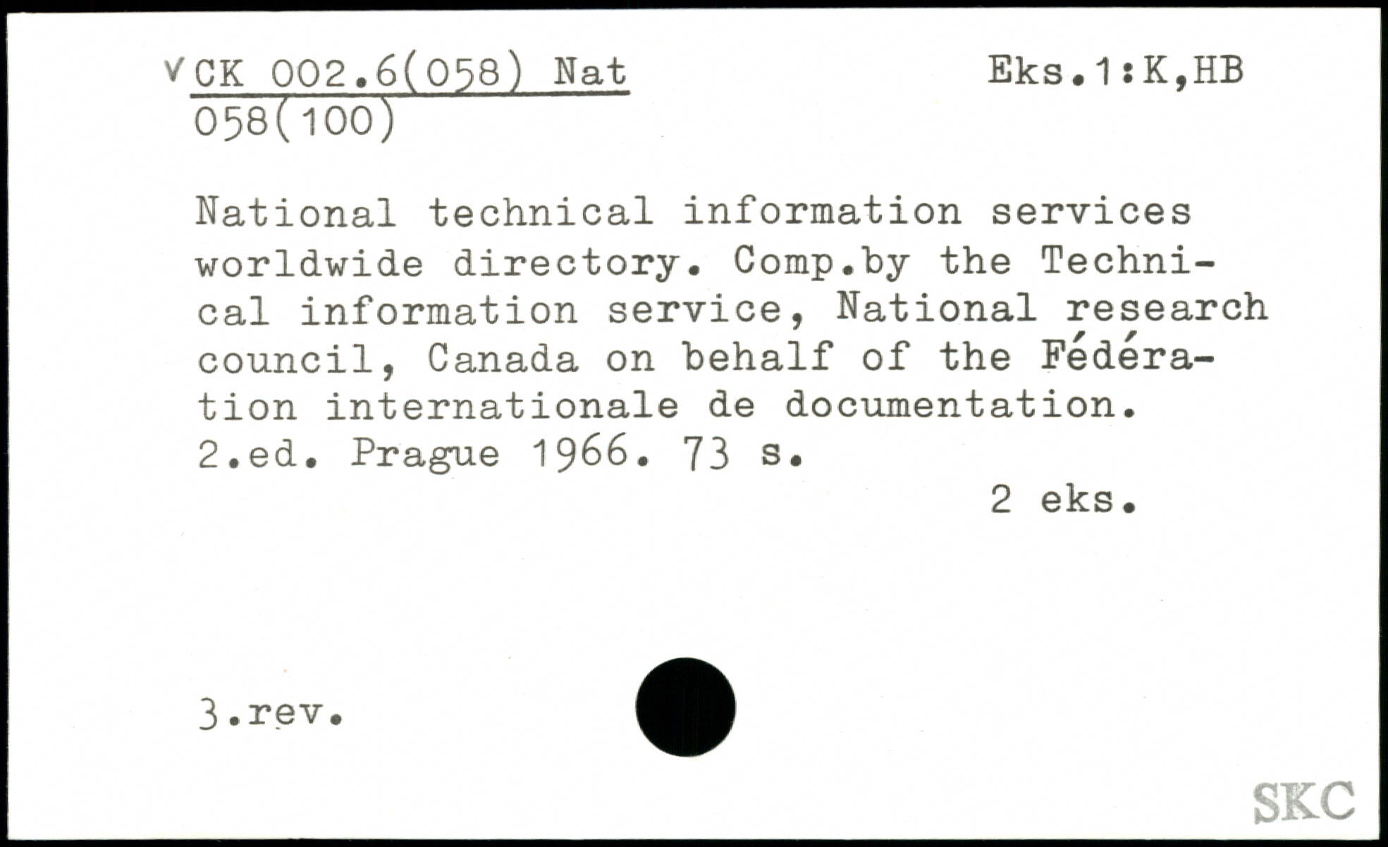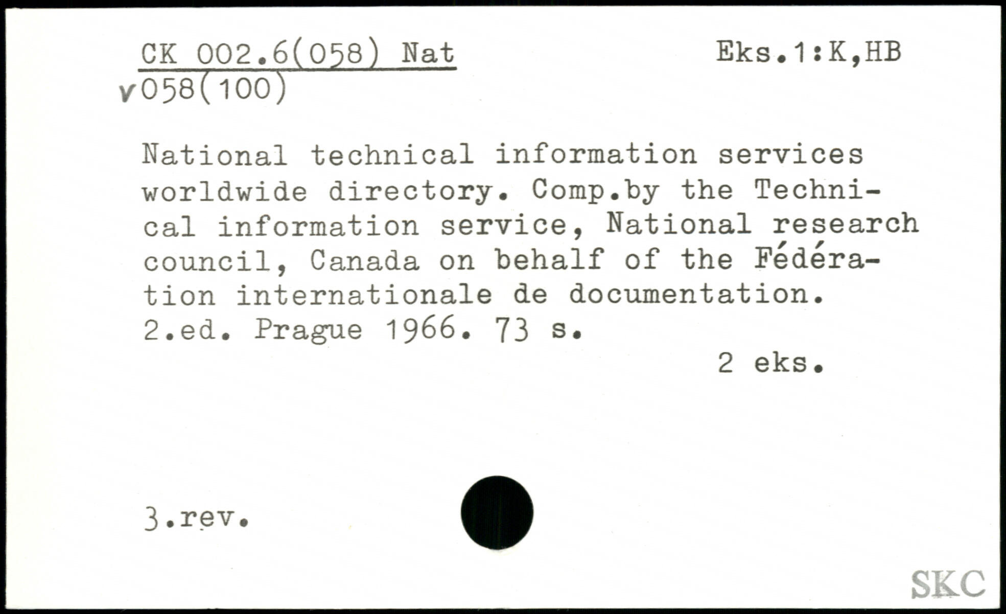 National technical information services worldwide directory. Comp.by the Technical information service, National research council, Canada on behalf of the Federation internationale de documentation.