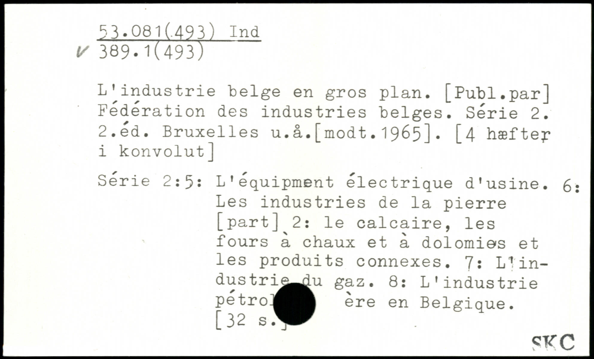 L[industrie belge en gros plan. [Publ.par] Fédération des industries belges. Série 2. 2.éd. Bruxelles u.â.[modt.1965]. [4 hæftep i konvolut] Série 2:5: L'équipment électrique d'usine. £. Les industries de la pierre [part] 2: le calcaire, les fours a chaux et a dolomies et les produits connexes. 'J: Lî in-dustrd^^^u gaz. 8: L'industrie pétro]^^^ ère en Belgique. [32 _gyç