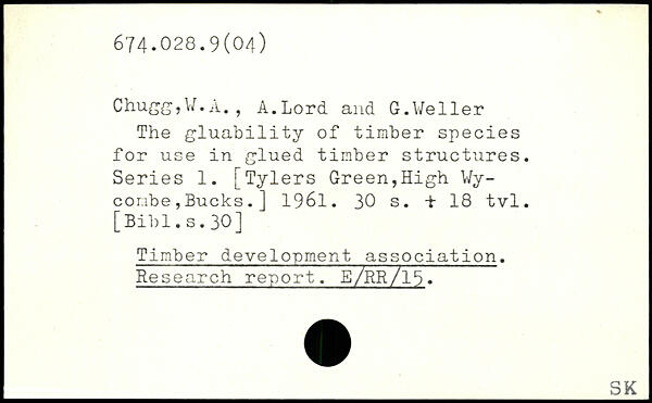 Chugg,W.A., A.Lord and G.Weller The gluability of timber species for use in glued timber structures. Series 1. [Tylers Green,High Wycombe ,Bucks. ] 1961. ]