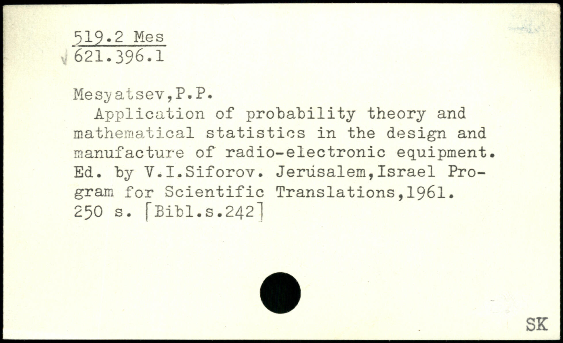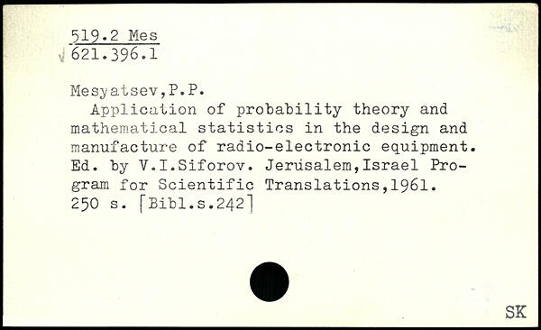 Mes;yatsev,P.P. Application of probability theory and mathematical statistics in the design and manufacture of radio-electronic equipment. Ed. by Y.I.Siforov. Jerusalem,Israel Program for Scientific Translations,1961.