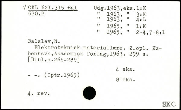 " 1963, " 4:L " 1965, " 1:K " 1965, " 2-4,7-8:L Balslev,N. Elektroteknisk materialisere. 2.opl.