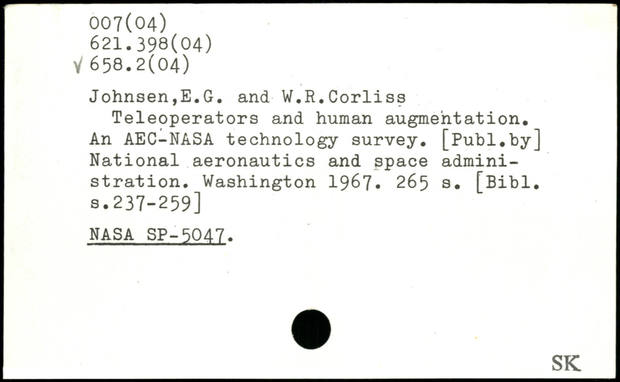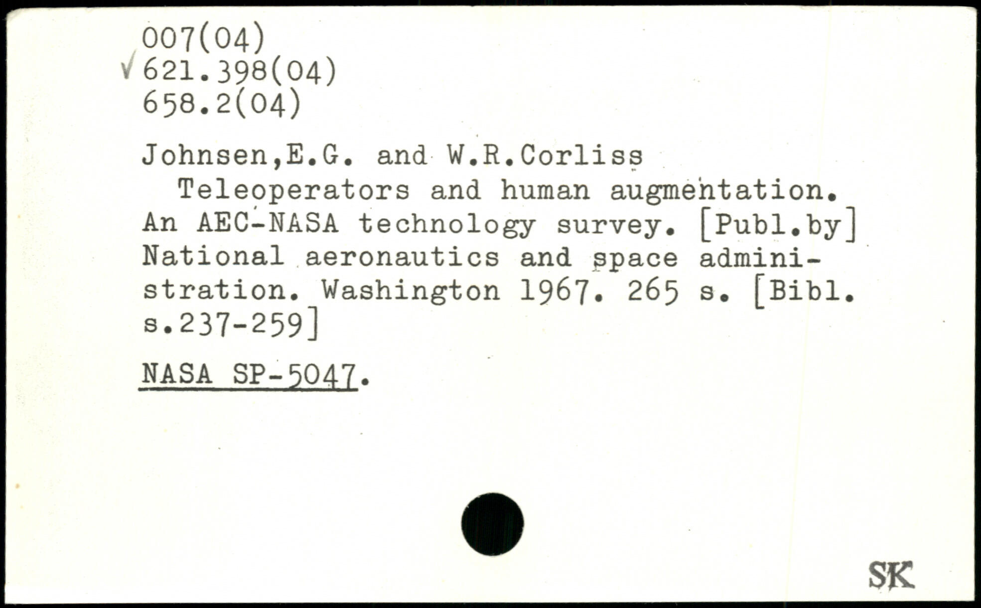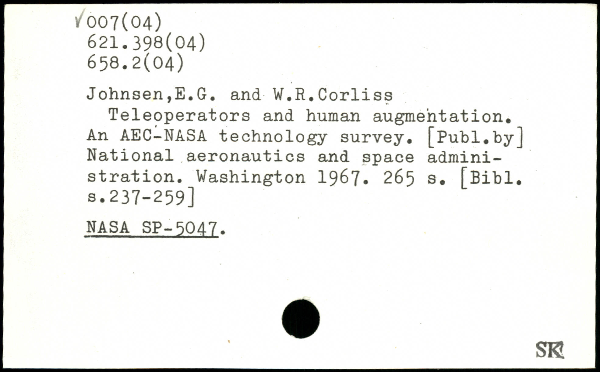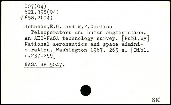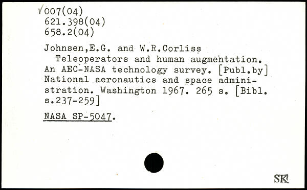 Johnsen,E.G. and ■ W.R.Corliss Teleoperators and human augmentation. An AEC-NASA technology survey, [publ.by] National aeronautics and space administration.