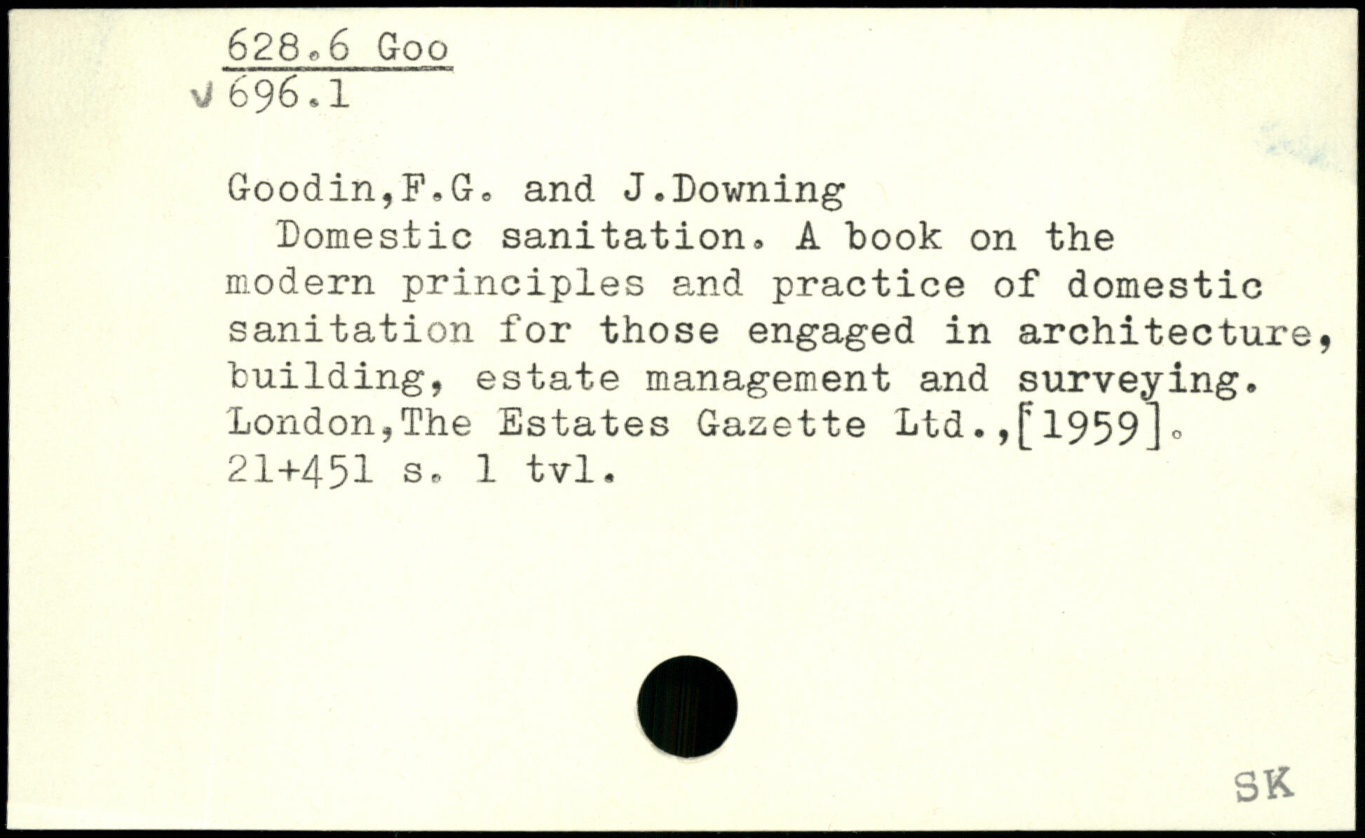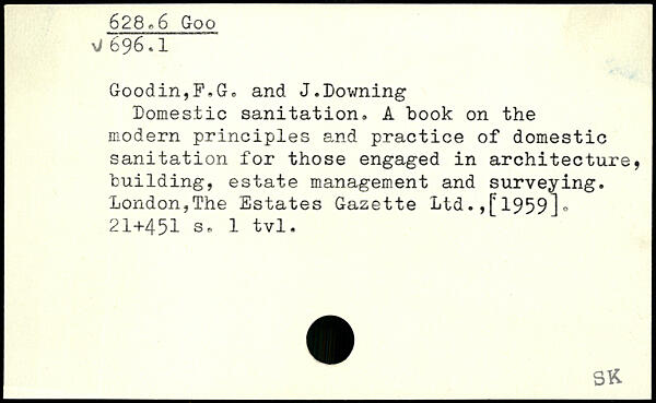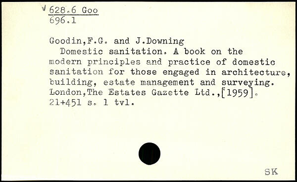 Domestic sanitation. A book on the modern principles and practice of domestic sanitation for those engaged in architecture, building, estate management and surveying. London,The Estates Gazette Ltd1959].