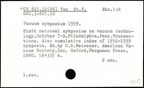 Vacuum symposium 1959, Sixth national symposium on vacuum technology , October 7"9iPiladelphia,Penn.Transactions. Also cumulative index of 1954-