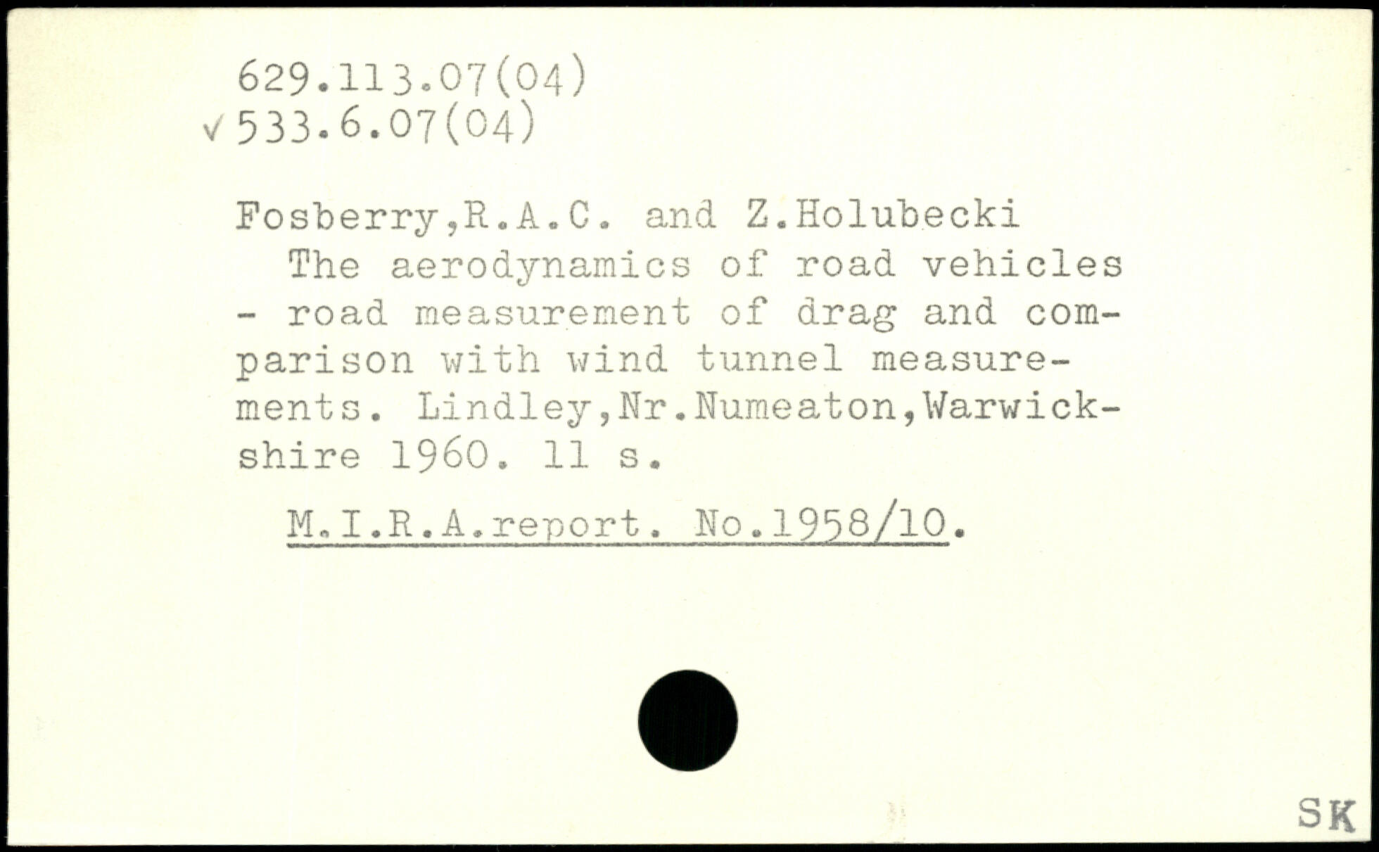 Fosberry,R.A.C. and Z.Holubecki The aerodynamics of road vehicles - road measurement of drag and comparison with wind tunnel measurements. Lindley,Nr.Nuraeaton,Warwickshire 1960