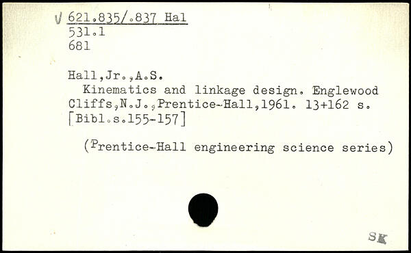 Hall,Jr0,AoS. Kinematics and linkage design. Englewood Cliffs?N,Jo9Prentice~Hall?1961.