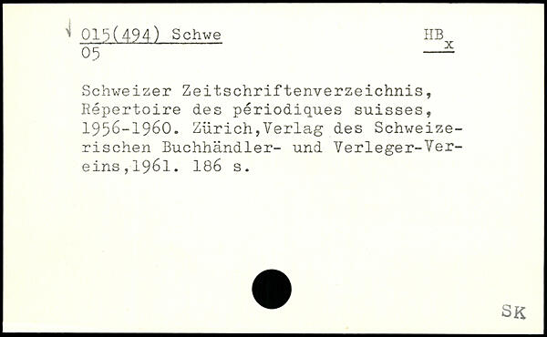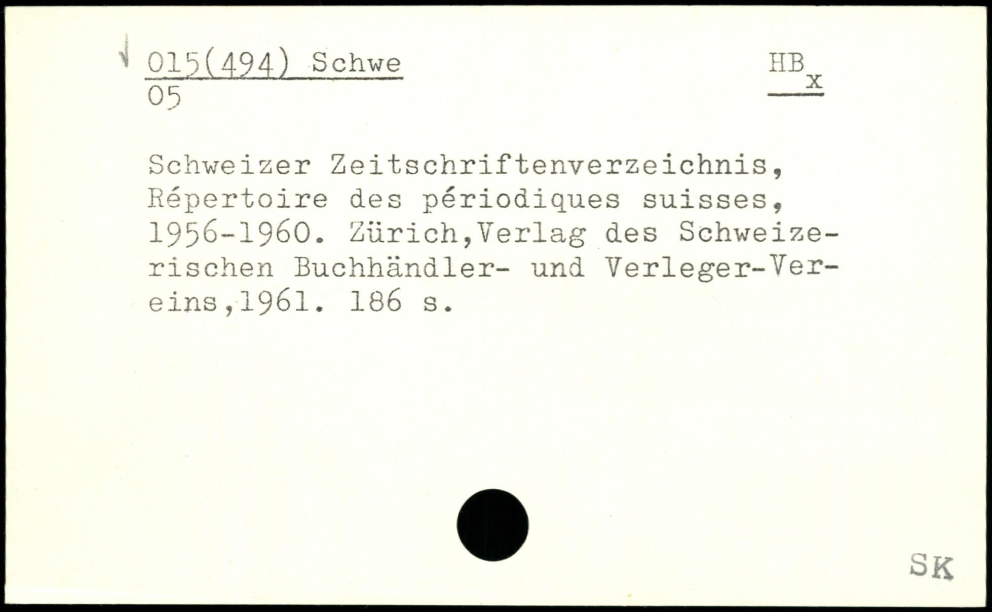 Schweizer Zeitschriftenverzeichnis, Répertoire des périodiques suisses, 1956-1960. Zürich,Verlag des Schweizerischen Buchhändler- und Verleger-Ver-eins,1961. 186 s.