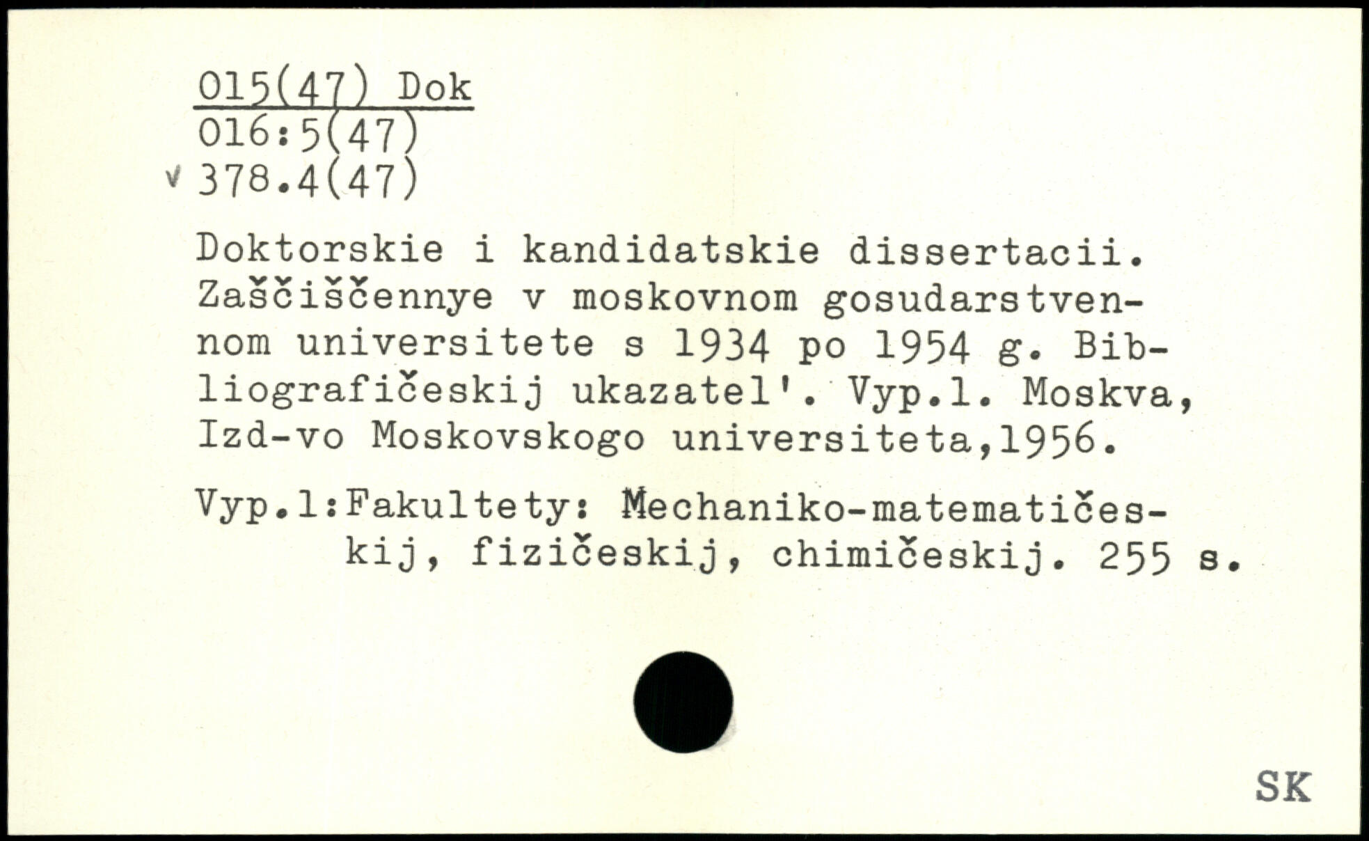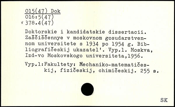 Doktorskie i kandidatskie dissertacii. Zasciscennye v moskovnom gosudarstven-nom universitete s 1934 po 1954 g. Bibliograf iceskij ukazatel'. Vyp.l.