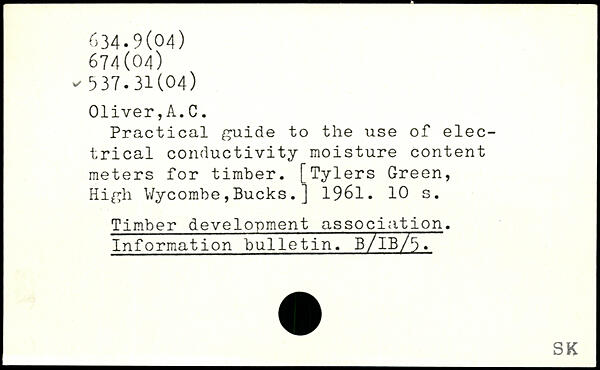 Practical guide to the use of electrical conductivity moisture content meters for timber. [Tylers Green, High Wycombe,Bucks.] 1961.