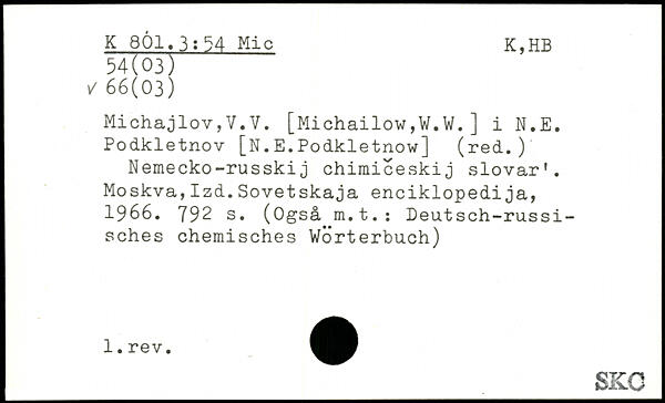Michajlov,V.V. [Michailow,V.W.] i N.E. Podkletnov [N.E.Podkletnow] (red.) Nemecko-russkij chiraiceskij slovar'. Moskva,Izd.Sovetskaja enciklopedija, 1966.