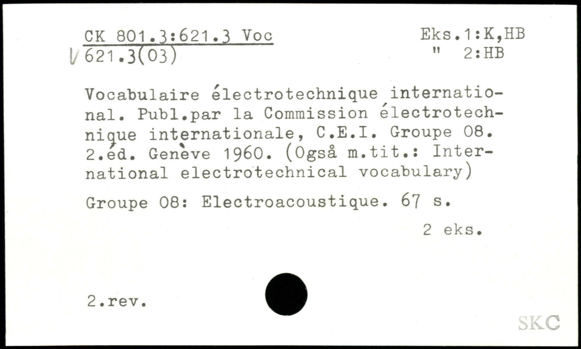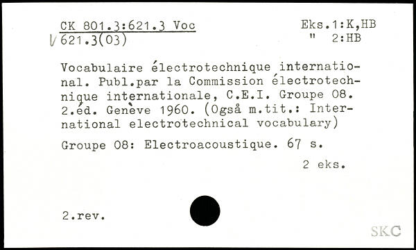 Vocabulaire électrotechnique international. Publ.par la Commission électrotechnique internationale, C.E.I. Groupe 08.